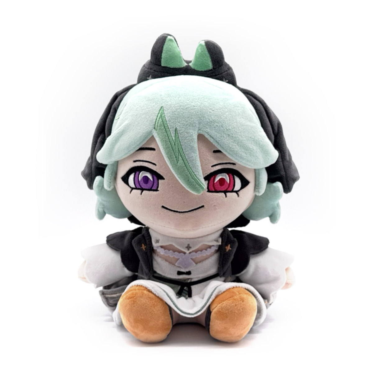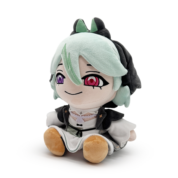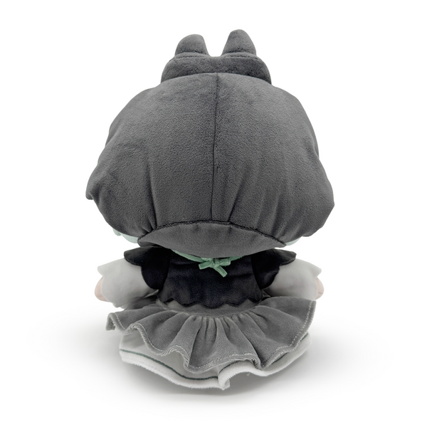 Jumping not only from the screen but also from the pages. Alias Anono has teamed up with us for her next published work, her very own Youtooz plush! Sitting at 9 inches tall with her legs kicked forward and wearing peach and black shoes and a frilly white dress with green layers and detailing, a black bolero covers her shoulders as a white necklace and frilled choker wrap around her neck. With pale green hair that has dark highlights falling past her shoulders and over her forehead, red and purple eyes look out from above a thin smile as a dark hood covers the back of her head with a pair of short ears on its top. This plush is packed to the seams with 100% PP cotton and is made of the softest minky material with accents of felt, perfect for cuddling or writing with!