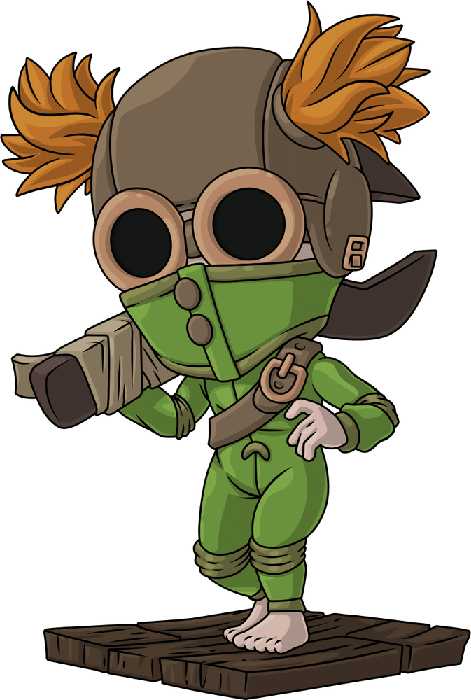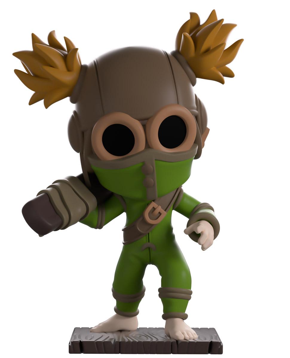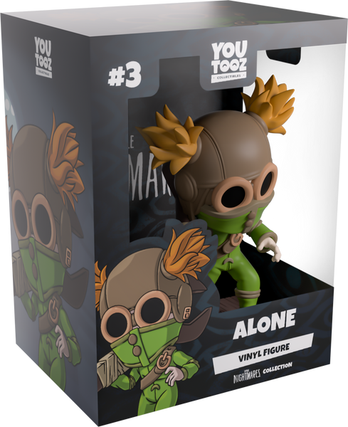 The next stop on Alone's escape from the Spiral is Youtooz! Standing bravely at 5 inches tall as she takes a cautious step forward with bare feet to minimize the noise, she wears an all-green jumpsuit with a giant wrench resting over her right shoulder. With an aviator-style helmet covering her head as a pair of orange pigtails poke through either side, the collar of her jumpsuit reaches up to cover her mouth as large goggles hide her eyes. The exterior of her packaging has been illustrated to show the silhouette of Alone inside a dingy moonlit storeroom. The interior is then covered in a pattern of obscure eyes which work their way onto the protective sleeve that is flooded with blue light from a pale city as her figure can be seen through the large clear window at its front. This collectible ships in a matte, embossed, protective outer sleeve and a custom-sized plastic protector for maximum protection during shipping.