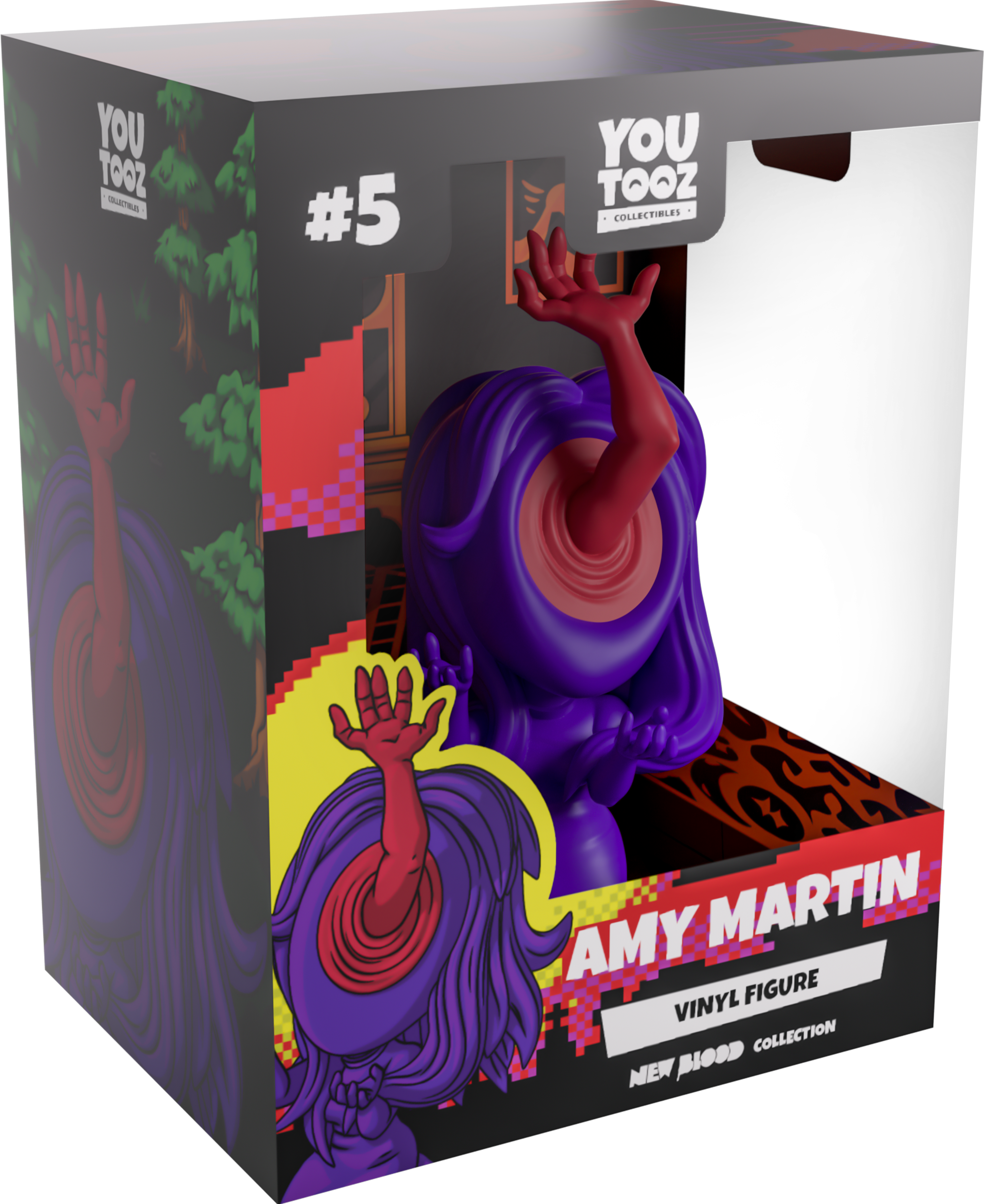 Youtooz has followed the trail of symbols into the attic to confront Amy Martin for her debut! Kneeling at 4.6 inches tall and throwing her hands forward in anguish as a demonic arm reaches towards the sky from the gaping hole where her face should be, long purple hair cascades from her head over her shoulders and arms as she wears a tight ankle-length dress. The exterior of her packaging sees a lone stone well in a dense forest, while the interior looks into an empty room with muted brown furniture. The protective sleeve is then covered in a pixelated pink and purple skyline of clouds and a setting sun, as her figure can be seen through the large, clear window at the packaging’s front. This collectible ships in a matte, embossed, protective outer sleeve and a custom-sized plastic protector for maximum protection during shipping.