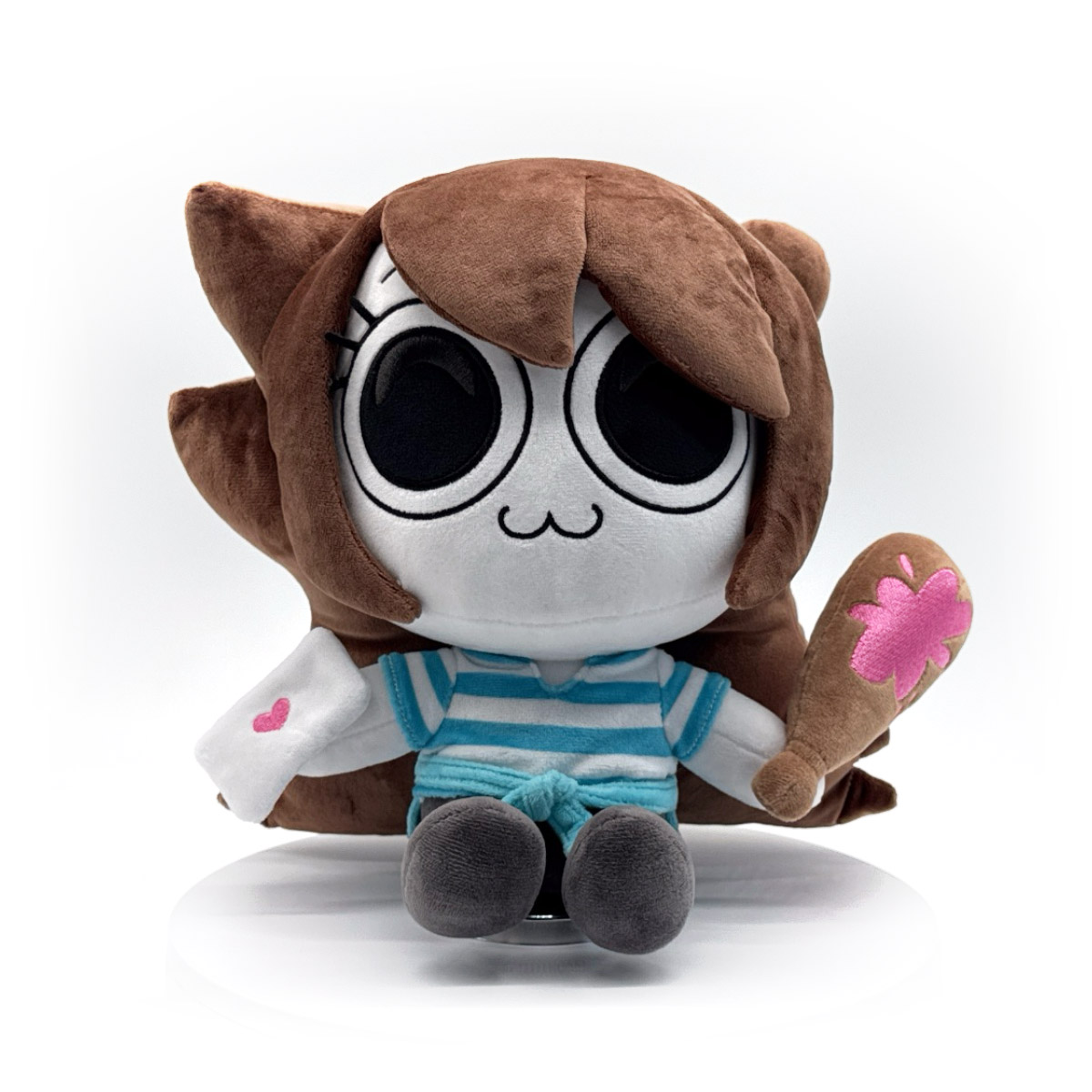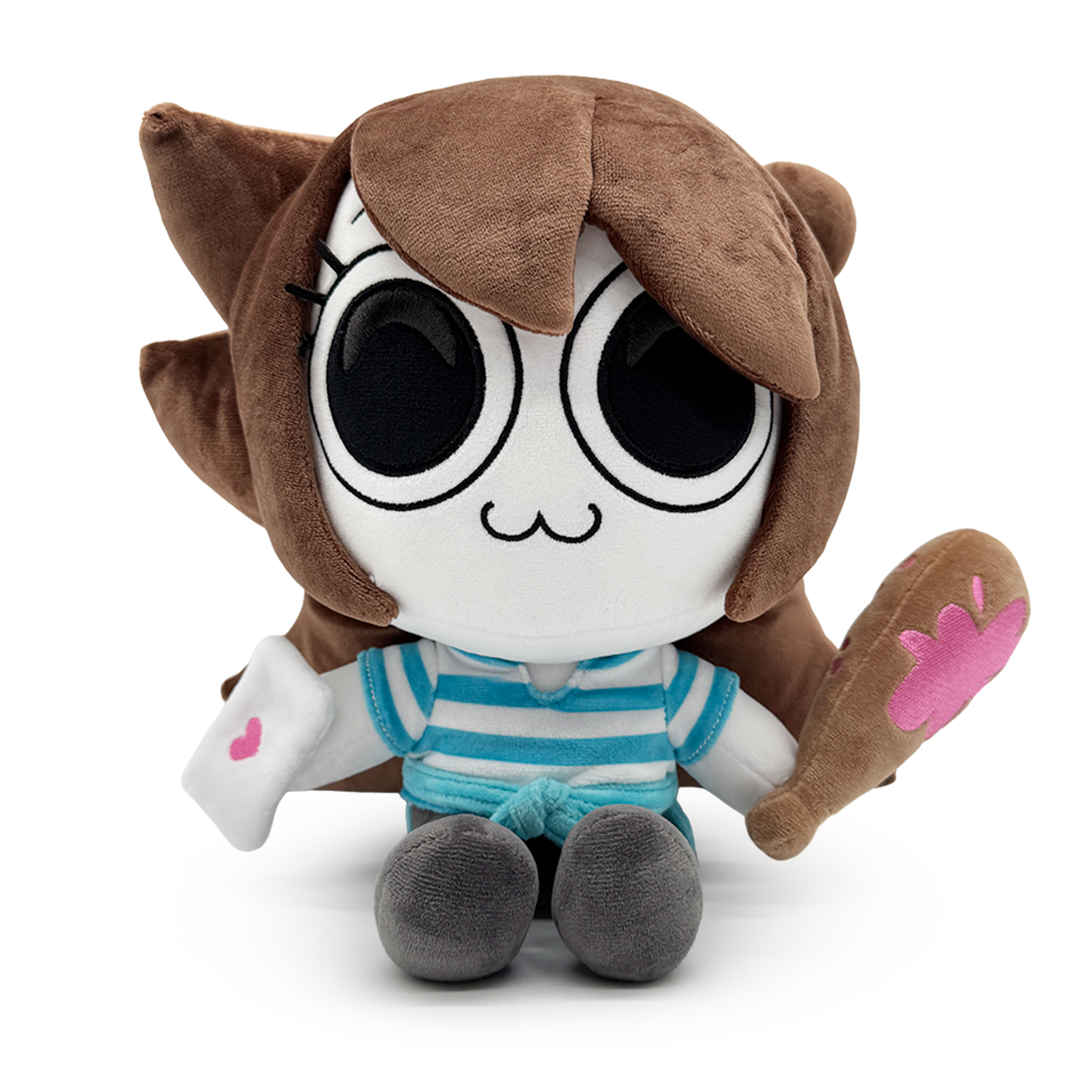 Aradir’s returned to Youtooz and has brought Aradira along for her own plush! Sitting at 9 inches tall with a pair of absolutely huge eyes beaming out from their pale face, which is covered in a bright pink splatter on the left cheek, a dark brown fringe sweeps across her forehead and falls down her back as she grips a long bat in her left hand. Wearing a striped blue and white shirt as a sweater is tied around her waist, she holds an envelope with a bright red heart in the center. This plush is packed to the seams with 100% PP cotton and is made of the softest minky material with accents of felt, absolutely perfect for cuddling or hitting things with!