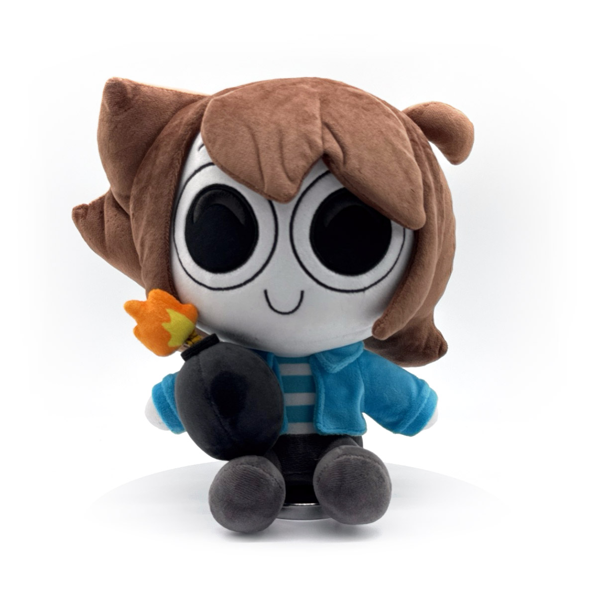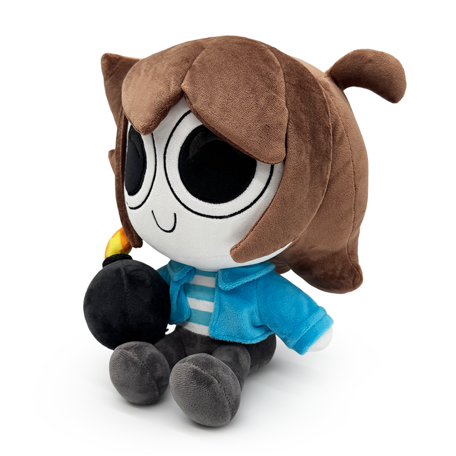 Aradir’s returning to Youtooz for their plush debut! And what do they have? Wait.. WHAT DO THEY HAVE?!!? Sitting at 9 inches tall with brown hair flicking out from their head and falling over huge, round eyes, a thin smile curls over his white face as he holds a round bomb with a flaming fuse in his right hand. Wearing a collared blue jacket over his blue and white striped shirt, grey pants match his shoes as their legs kick forward lazily. This plush is packed to the seams with 100% PP cotton and is made of the softest minky material with accents of long pile, absolutely perfect for cuddling or blowing things up with! (not really!)