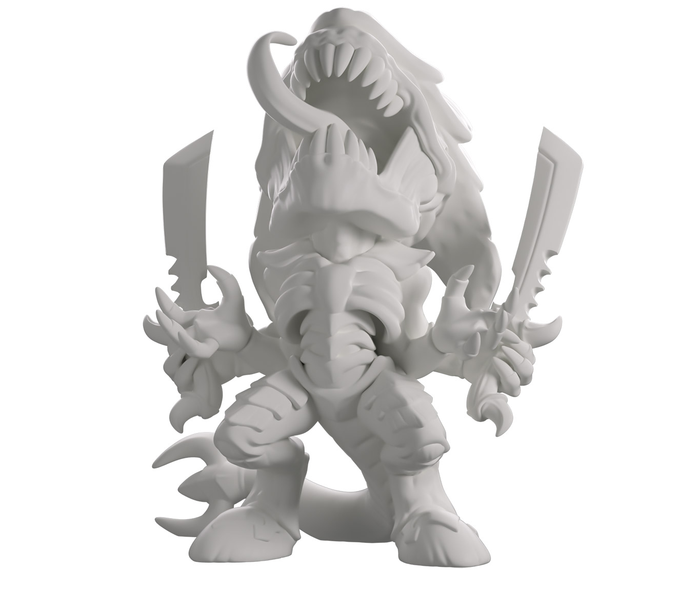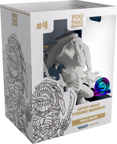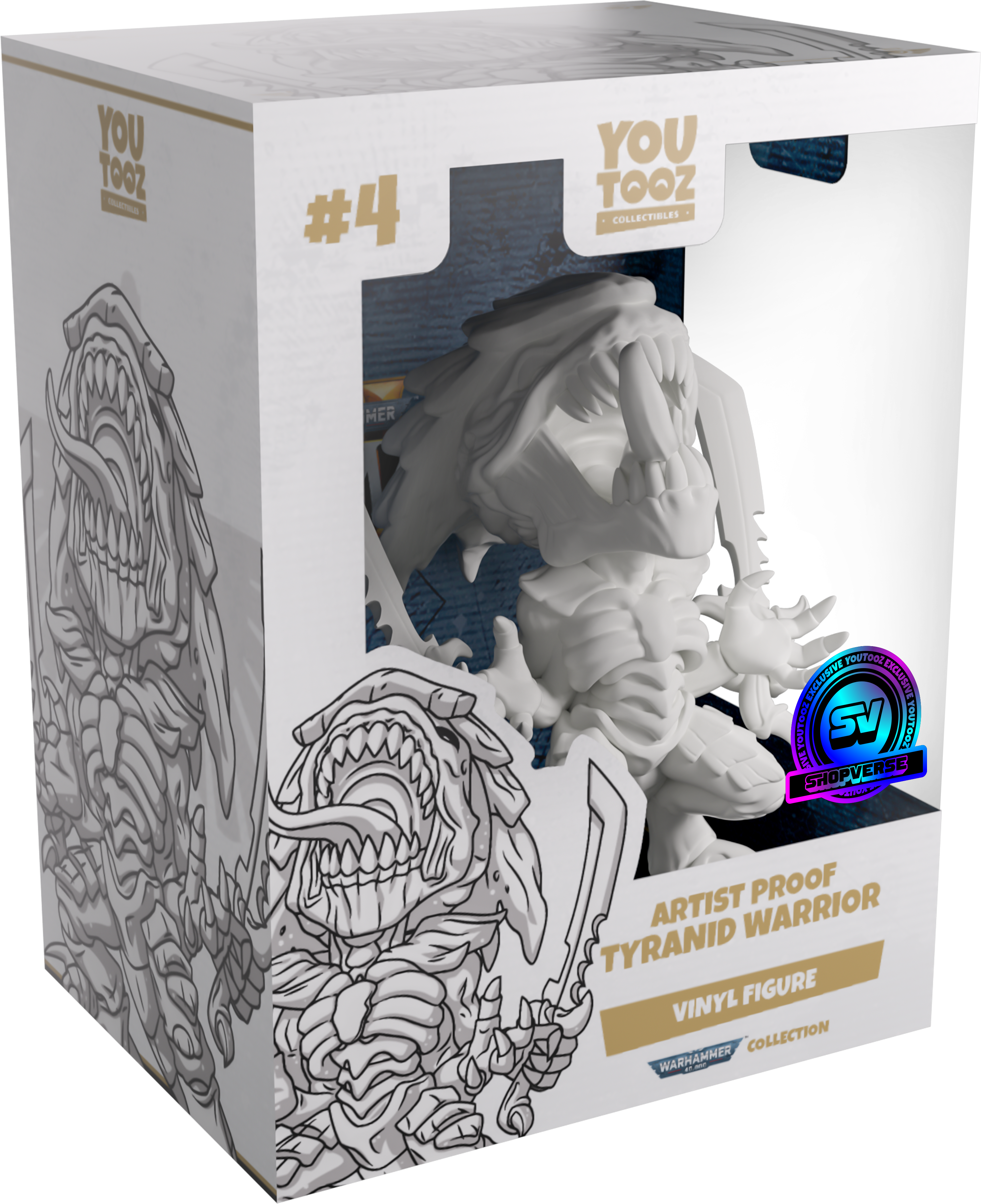 The Tyranid Warrior has returned to Youtooz in perfect unpainted terror with our new Artist Proof version of their figure! Leaning back as they let out a blood-curdling screech at 4.2 inches tall, a long tongue curls out from behind sharp teeth as a jagged carapace juts back from their head in a series of plates. With a pair of bone swords held in two of their hands as the other two open out to their front, muscles peer through a bony torso and their knees, as a thick tail wraps around from the back with a sharp three-pronged tip. The exterior of their packaging sees them standing in a golden arch, while the dark blue interior has gold lines around the border. This then continues onto the white and black protective sleeve where their figure can be seen through the large clear window at the packaging’s front. This collectible ships in a matte, embossed, protective outer sleeve and a custom-sized plastic protector for maximum protection during shipping.