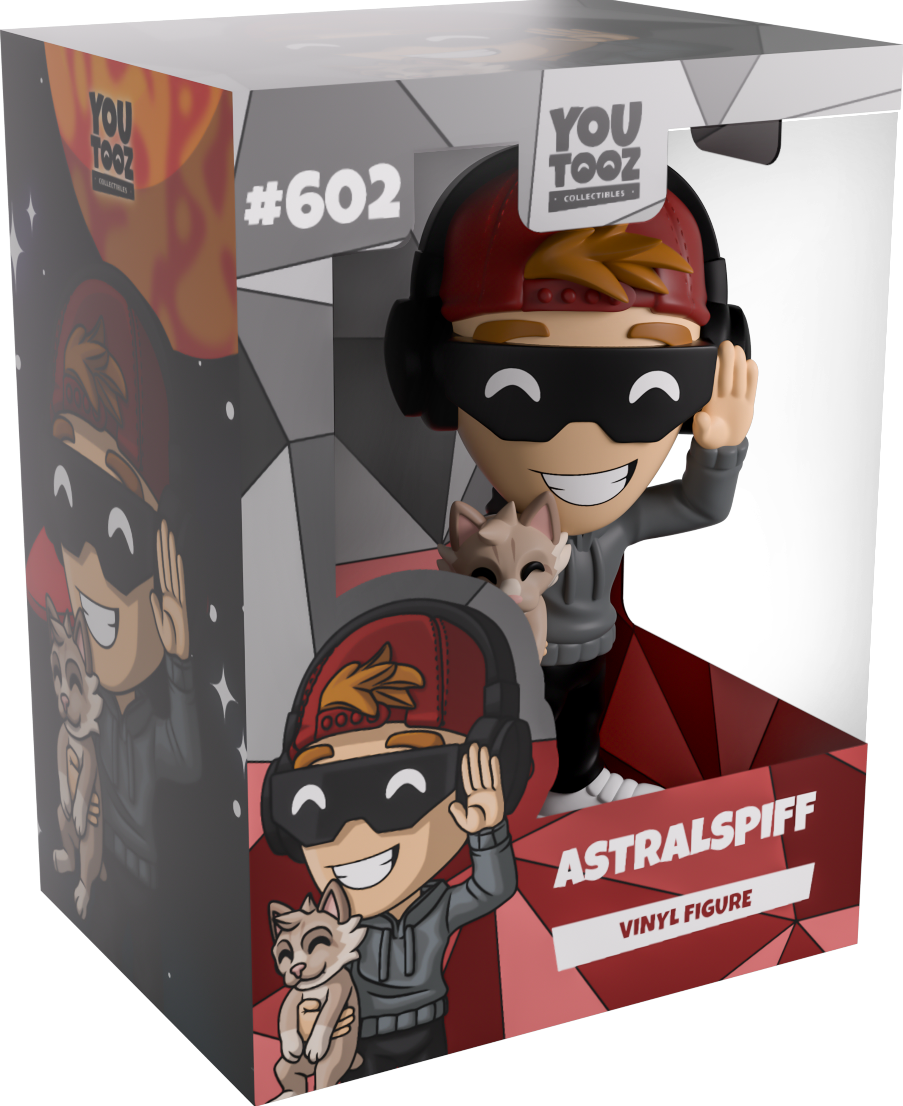 Astralspiff is back at Youtooz and this time he's ready to be turned into his first vinyl figure! Dressed in a cozy dark gray hoodie completed with black pants and fresh white kicks, Astralspiff is posed with his left hand giving a friendly wave and his right arm is holding his cute little furry friend! He is accessorized with a red cap and black headphones, ready for whatever game is waiting to be played! This concept was designed by Daileh on the Youtooz Community.