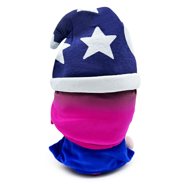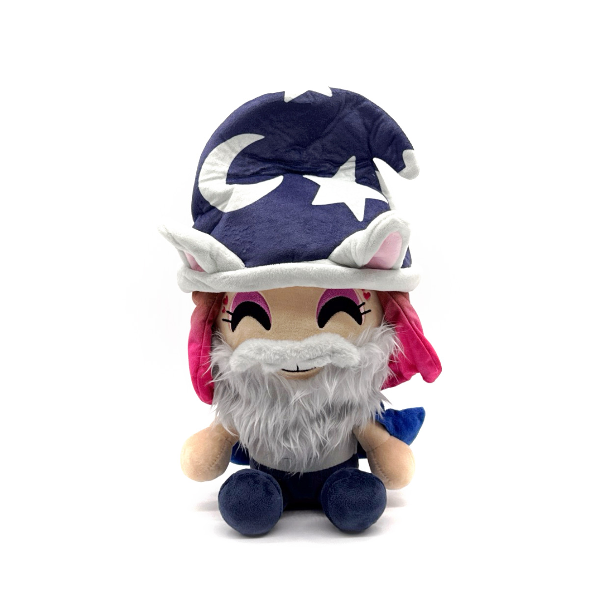 Is your book report ready? Because Athena P has arrived at Youtooz for her plush debut, and she’s a tough grader! Sitting at 9 inches tall with purple and pink shadowed eyes that beam out from above the ecstatic smile peeking through her removable grey beard, she wears a floppy wizard hat that’s covered in a star and moon pattern with a pair of pointed wolf ears on the front. With brown hair that has pink ends falling down to her shoulders, she wears a blue cape tied around her neck along with a grey shirt that has a painted pair of shorts on the chest and dark pants. This plush is packed to the seams with 100% PP cotton and is made of normal and long pile minky materials, absolutely perfect for cuddling or deep diving with!