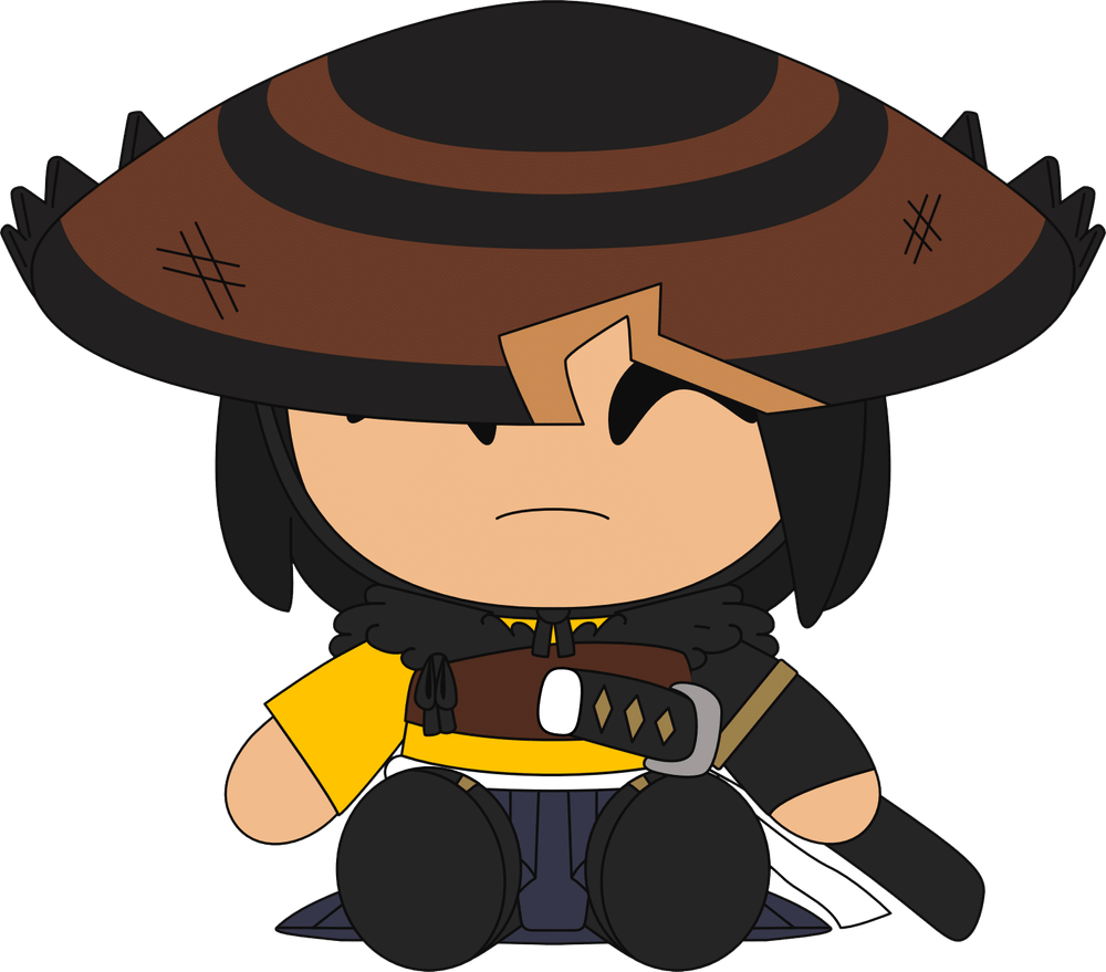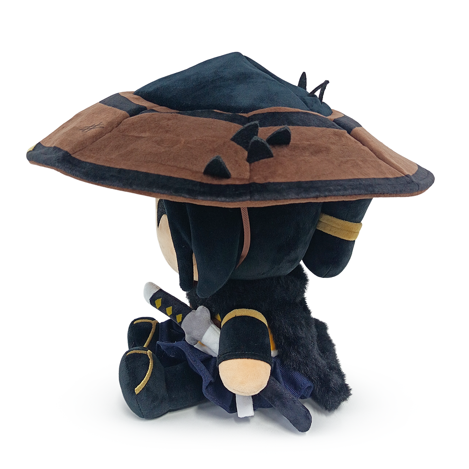 Atsu’s taken some well-deserved time off from revenge to arrive at Youtooz with her very own plush! Sitting at 9 inches tall and peering out from underneath the rim of a brown and black rōningasa that has a gash in the front, long black hair is pulled into a knot at the back of her head and falls down either side of her pensive face. With her left arm resting over the katana strapped to her side, she wears a feathery black cloak over brown and yellow armor as sandaled feet kick out from a pleated blue hakama. This plush is packed to the seams with 100% PP cotton and is made of normal and long pile minky materials with accents of tricot and felt, absolutely perfect for cuddling or getting revenge with!