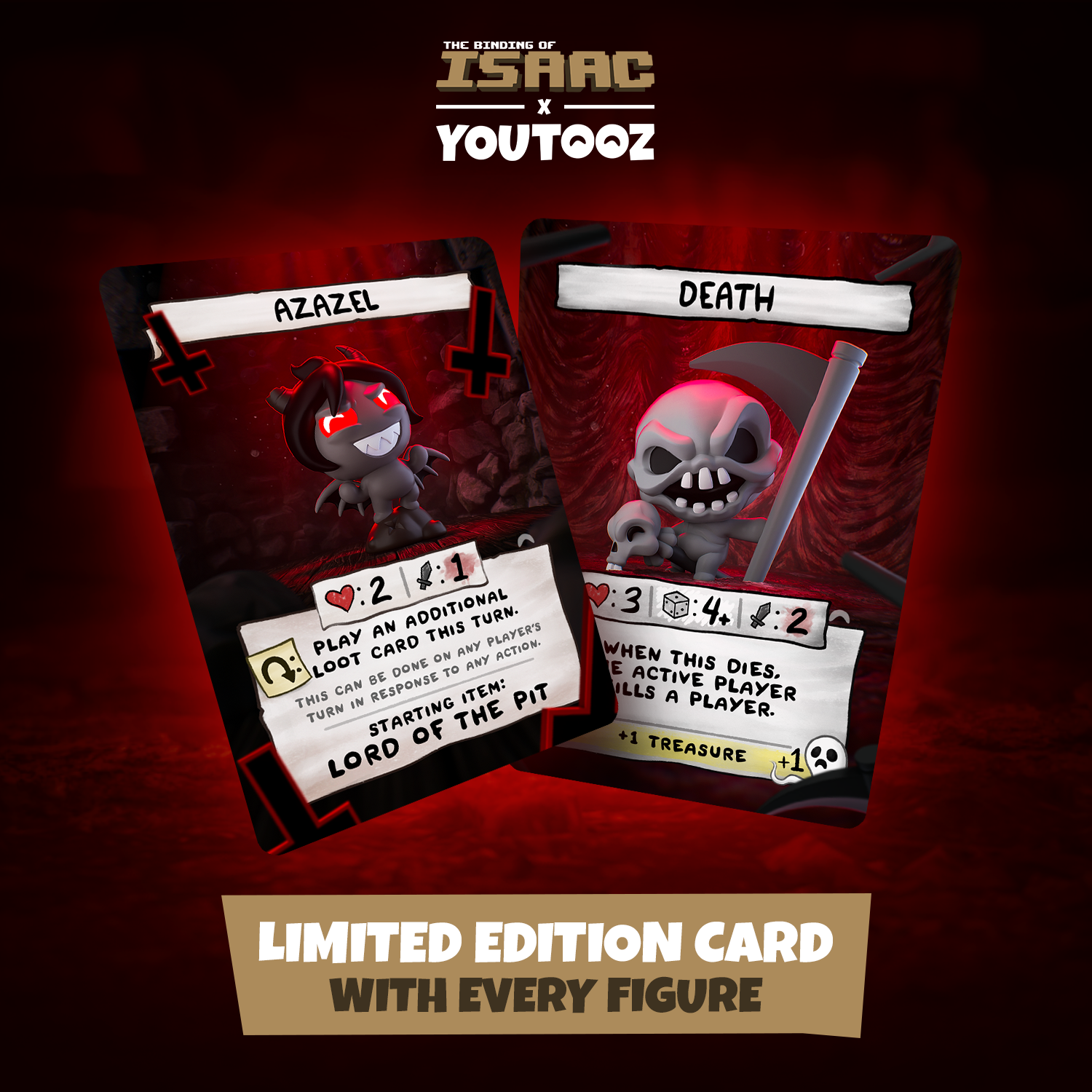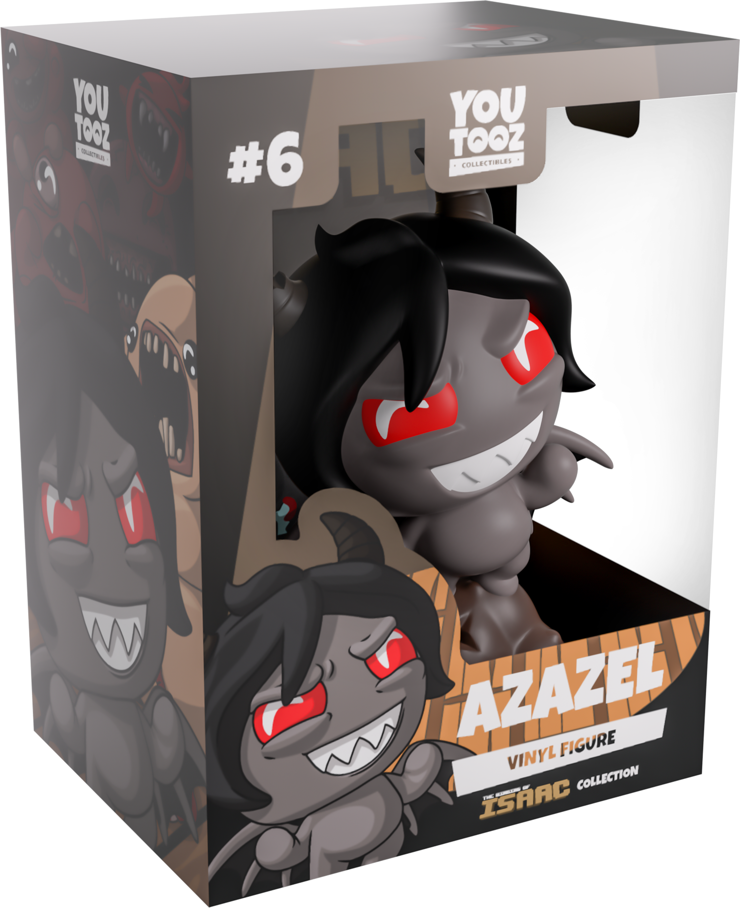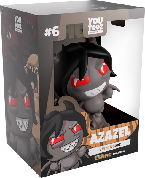 Azazel didn’t need to make a deal with the devil for their own Youtooz figure, but that didn’t stop him! Standing on top of a lump of coal at 3.8 inches tall with a toothy evil grin and vibrant red eyes as a pair of horns poke of from the pitch black hair covering his head, round hands curl out from a small dark grey body as spikey wings with black membrane stretch out from each shoulder. The exterior of their packaging sees a shabby picture of them on a bloody wooden floor, while the interior is pitch black with a single spotlight shining down on them. The protective sleeve then looks into a room filled with pots and a chest as their figure can be seen through the large clear window at its front. This collectible ships in a matte, embossed, protective outer sleeve and a custom sized plastic protector for maximum protection during shipping.