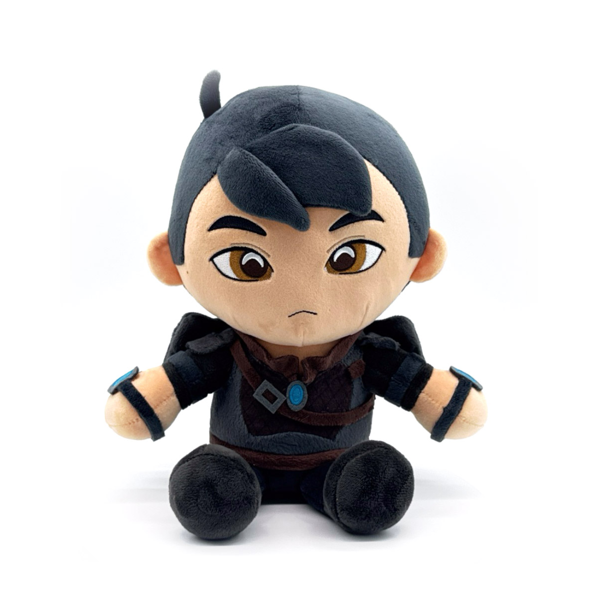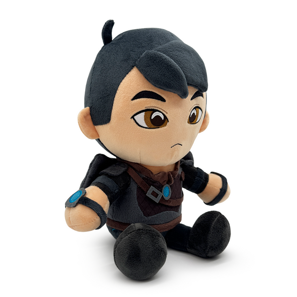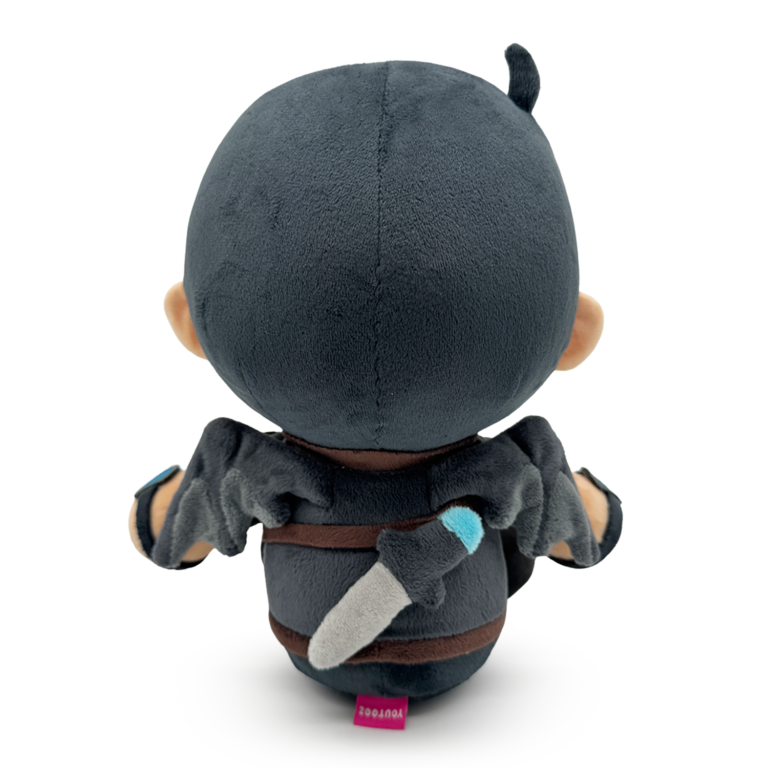Azriel has intercepted a secret message and infiltrated Yotuooz for his plush debut! Sitting at 9 inches tall with unreadable hazel eyes resting above a blank mouth, short black hair sweeps over his forehead with a strand poking up from the back as a pair of dark wings extend from his shoulders. Wearing a grey scaled armor top that has a pair of brown straps around the chest and waist, the glittering blue Siphon on his collar matches the ones on his gloves as his legs kick forward with black shoes on his feet. This plush is packed to the seams with 100% PP cotton and is made of minky and felt with accents of glitter material, absolutely perfect for cuddling or uncovering secrets with!