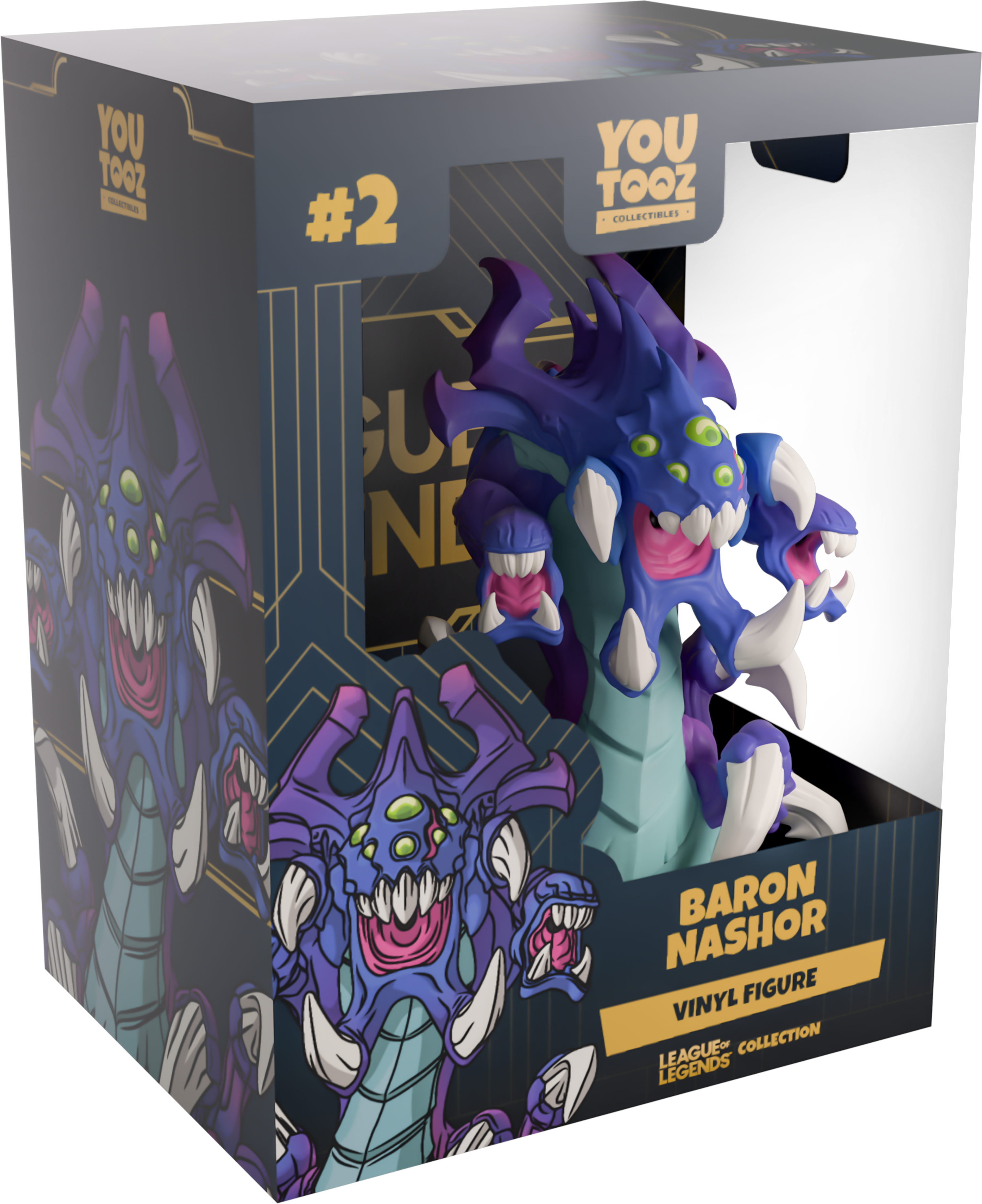 Can you take down Baron Nasher to gain its power-up?! Raising up at 4.6 inches tall with 6 glowing green eyes above a terrifying tooth filled mouth that has sharp bony mandibles jutting out from either side, their blue head stretches back into a series of thick armor plates as bright pink spines run down their back. With horrifying extra mouths curling over each shoulder and a pale green segmented underside, devastating claws thrash out from either side of its snaking purple body. The exterior of their dark blue packaging is covered in thin golden lines and a black bar through the middle. This pattern then continues through the interior and onto the protective sleeve, where their figure can be seen through the large, clear window at the packaging’s front. This collectible ships in a matte, embossed, protective outer sleeve and a custom sized plastic protector for maximum protection during shipping.