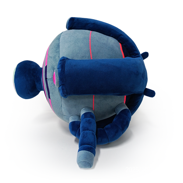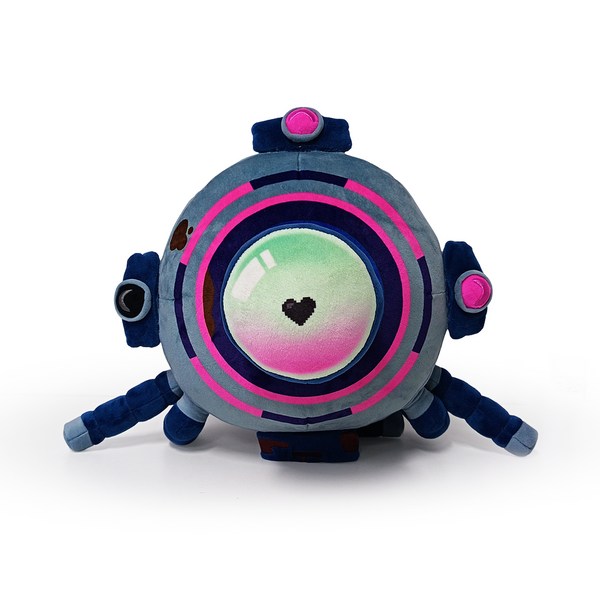 Are you looking for some back-up while traversing the treacherous Petrichor V? Well, we’ve got the best lil’ buddy you could ask for! Floating in at 9 inches tall with a black digital heart at the center of the extended screen that pokes forward from a spherical dirt-splotched body, pink and blue lines circle their front as thick blue bands wrap around the top and sides to connect at the back, and long pipes dangle from their base. This plush is packed to the seams with 100% PP cotton and is made of the softest minky material, absolutely perfect for cuddling or as your best bud!