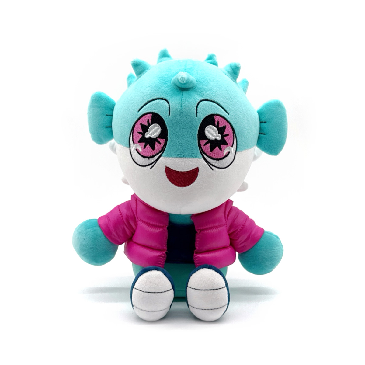 We just couldn't keep Big Puffer out of Youtooz, no literally! He kicked down the door for his plush debut! Sitting at 9 inches tall with his legs kicked forward as he gazes up with sparkling pink and black eyes that rest above a curved smile, short spikes cover his teal and white head as a pair of fins poke out from either side and he wears his iconic pink puffer jacket over a dark shirt along with green pants and blue shoes. This plush is packed to the seams with 100% PP cotton and is made of minky and nylon absolutely perfect for cuddling or gaming with!