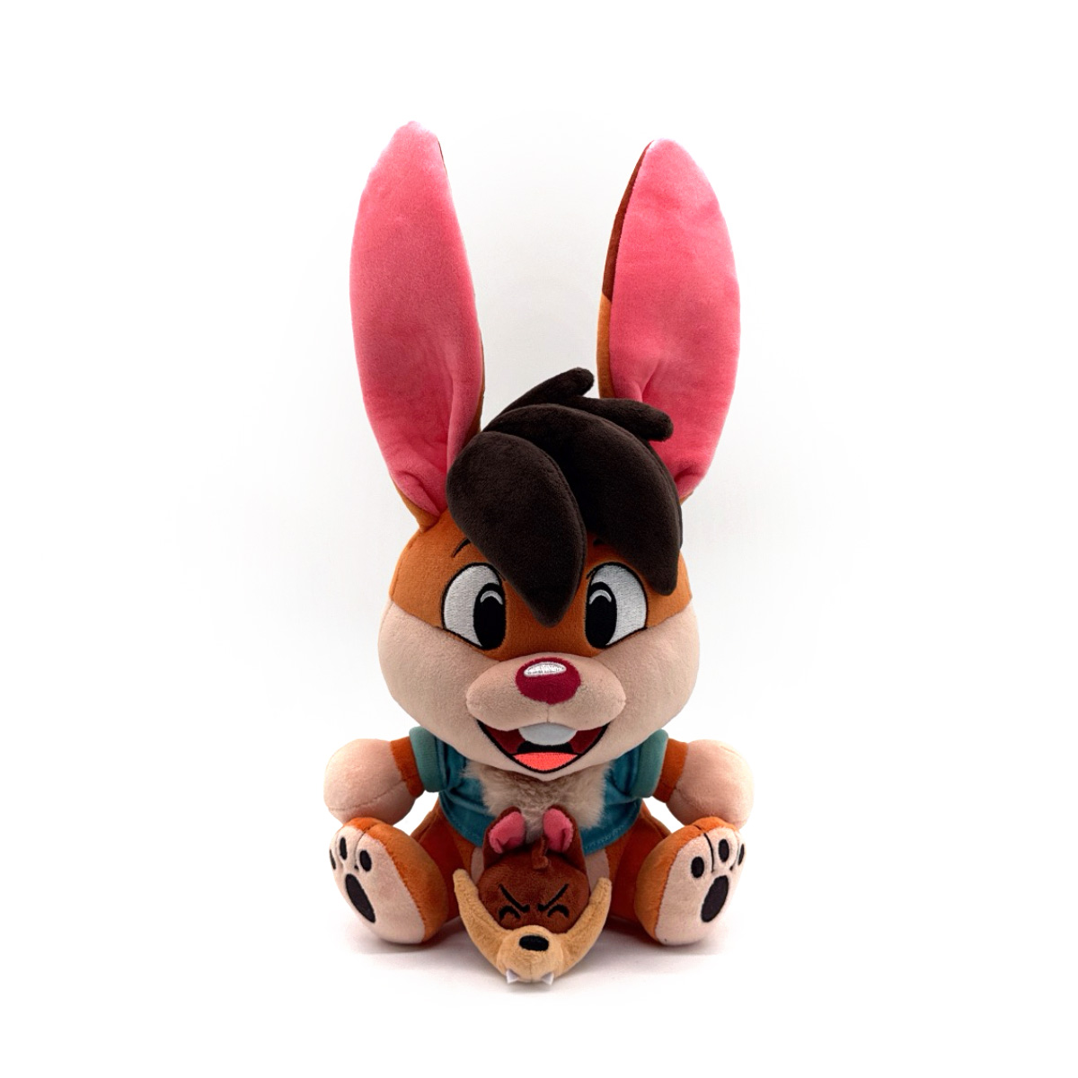 Billy Buns has hopped his way into Youtooz looking for Hank! Looks like he was a little late, though and will have to settle for his own plush debut instead! Sitting at 9 inches tall with buck teeth hanging from the huge open smile that crosses his light face under a magenta nose, a thick brown fringe falls over his forehead as long pink ears reach out from the top of his head. Wearing a light blue checkered shirt with a thick puff of fur poking out from the collar, an adorable little Hank head is held to his stomach by velcro between outstretched legs as a short tail pokes out from his back. This plush is packed to the seams with 100% PP cotton and is made of normal and long-pile minky materials, absolutely perfect for cuddling or hopping around with!