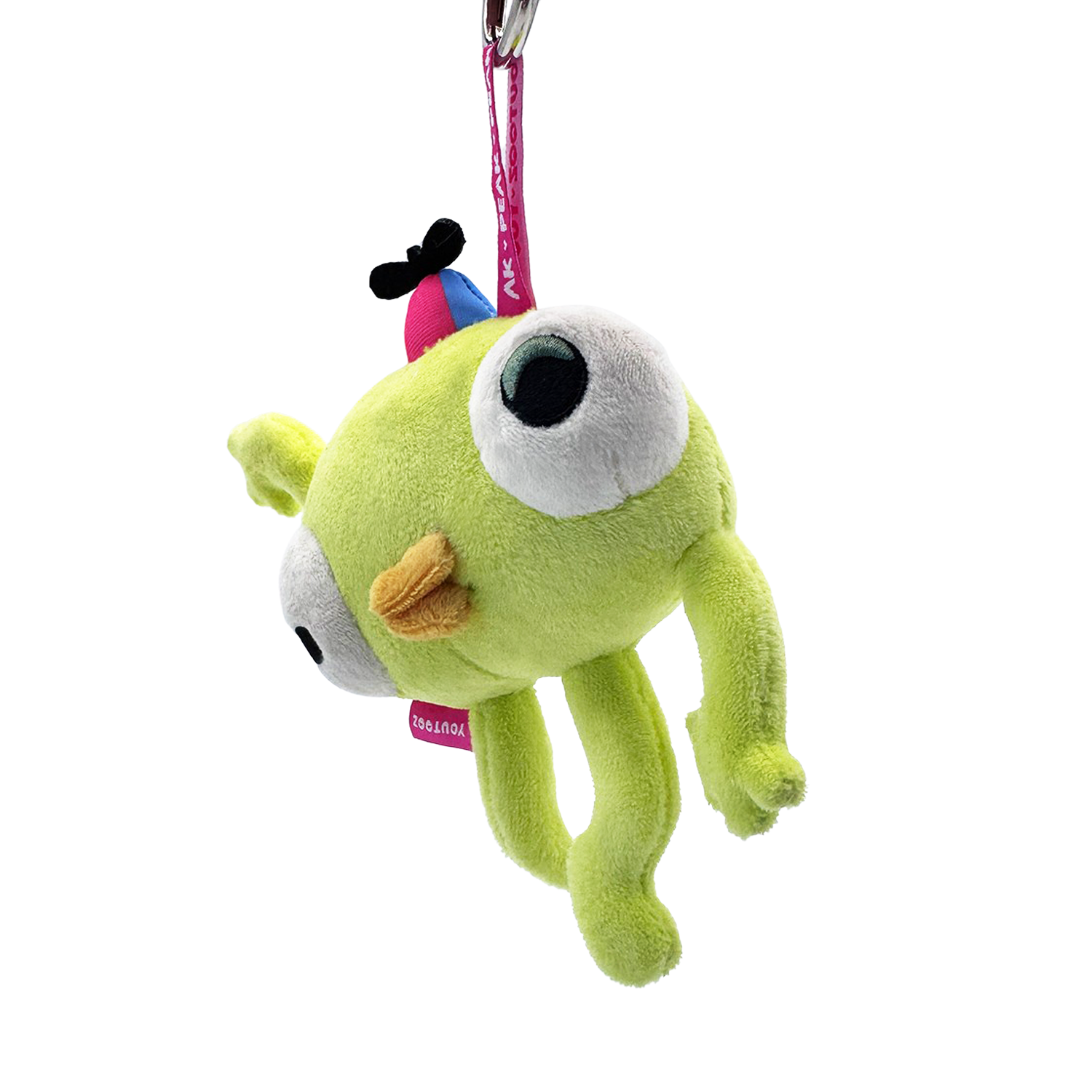 Oooh, look what we just found! Oh, don’t mind the plane crash... Just look at Bing Bong! At 5 inches tall with mismatching eyes that look in different directions and an open pink mouth on their oblong green body, a colorful propellor hat rests atop their head as their thin limbs flail out awkwardly from the sides and bottom. This keychain is packed to the seams with 100% PP cotton and is made of minky and tricot materials with accents of felt and a keyring attached to the top by a pink tag, absolutely perfect to hang from your backpack, purse, pants or wherever you want to show off while scaling the tallest peaks!