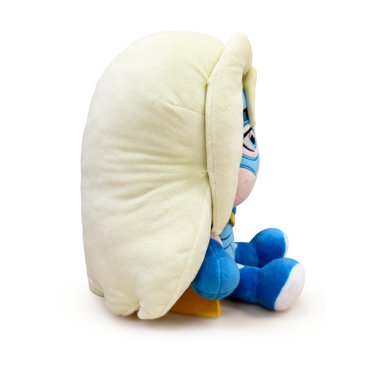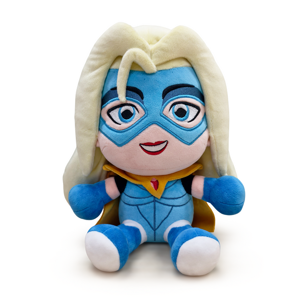 When Blonde Blazer says she wants a Youtooz, you make her a Youtooz! There’s no way we were gonna say no! Sitting at 9 inches tall, a huge smile on her face as a blue mask covers the top, leaving her bright, kind eyes visible, long blonde hair parts in the middle and falls down her back as a single strand flicks over her forehead. Wearing a light blue suit that has a yellow collar with a red gem at its center, a long cape hangs from her shoulders as dark blue gloves match her boots. This plush is packed to the seams with 100% PP cotton and is made of the softest minky material, absolutely perfect for cuddling or fighting crime with!