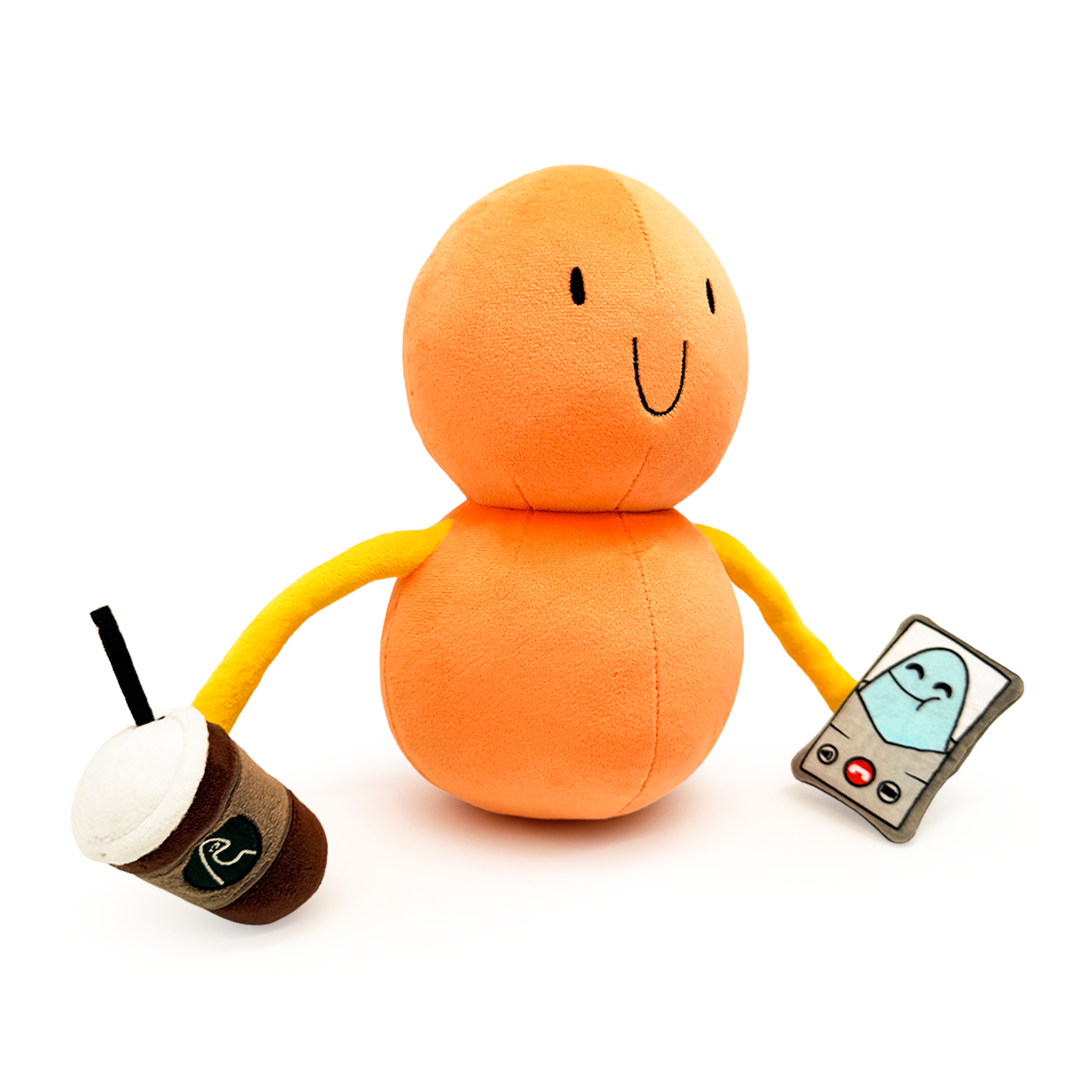We just got back from our vacation in the land of Boggs, and Boe's tagged along on our journey back for their plush debut! Standing at 9 inches tall with an orange body that has a round base and a matching head with a huge smile and skinny yellow arms, she comes complete with her favorite drink and cellphone which are attached to either hand with velcro patches. This plush is packed to the seams with 100% PP cotton and is made of the softest minky material, perfect for cuddling or making friends with!