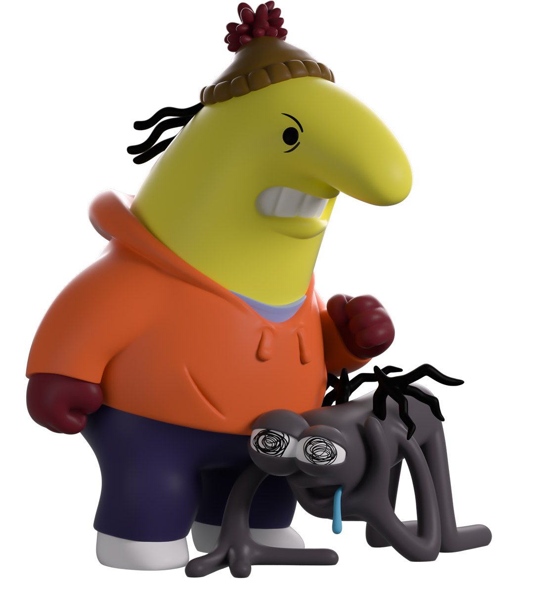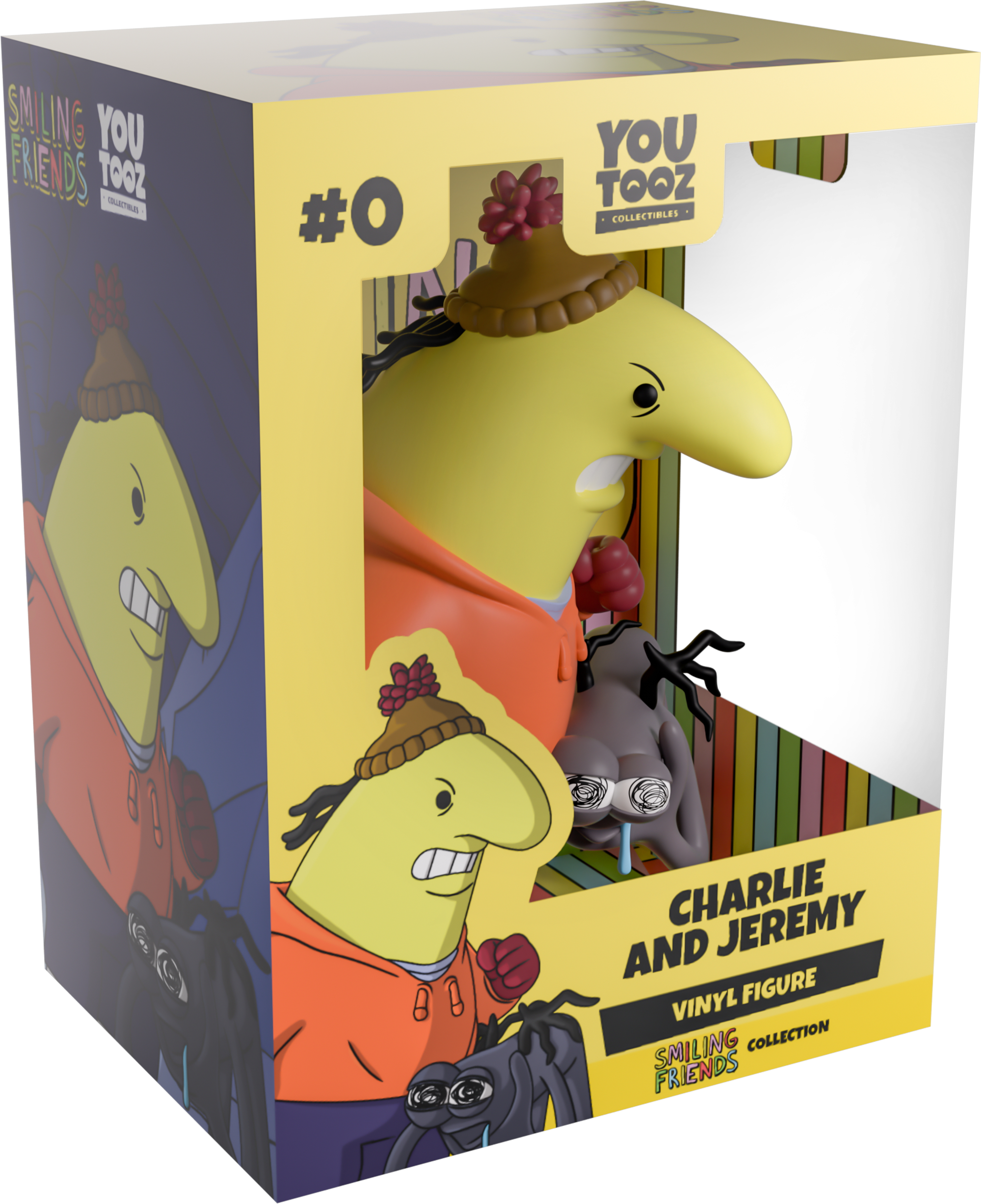 Charlie and Jeremy have arrived at Youtooz in search of some hellish entertainment with their debut! Standing at 4.7 inches tall and clenching his fist after letting Jeremy have a swift (and deserved) punch to the stomach, anger crosses Charlie’s yellow face as he wears a brown beanie with a maroon pompom and an orange hoodie along with blue pants. While crouching on the ground to his front, Jeremy grasps at his throat with long dark fingers, gasping for air as a single strand of drool falls from his mouth. The exterior of their packaging sees the moment right after Charlie’s devastating punch, while the interior is filled with vertical rainbow stripes and has the ‘Smiling Friends’ logo on the back. The protective sleeve is then a pale yellow, as their figures can be seen through the large, clear window at the packaging’s front. This collectible ships in a matte, embossed, protective outer sleeve and a custom-sized plastic protector for maximum protection during shipping.