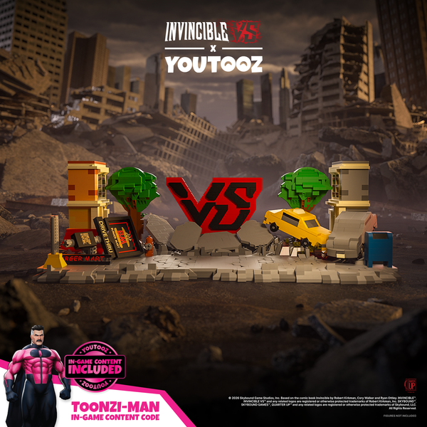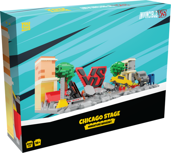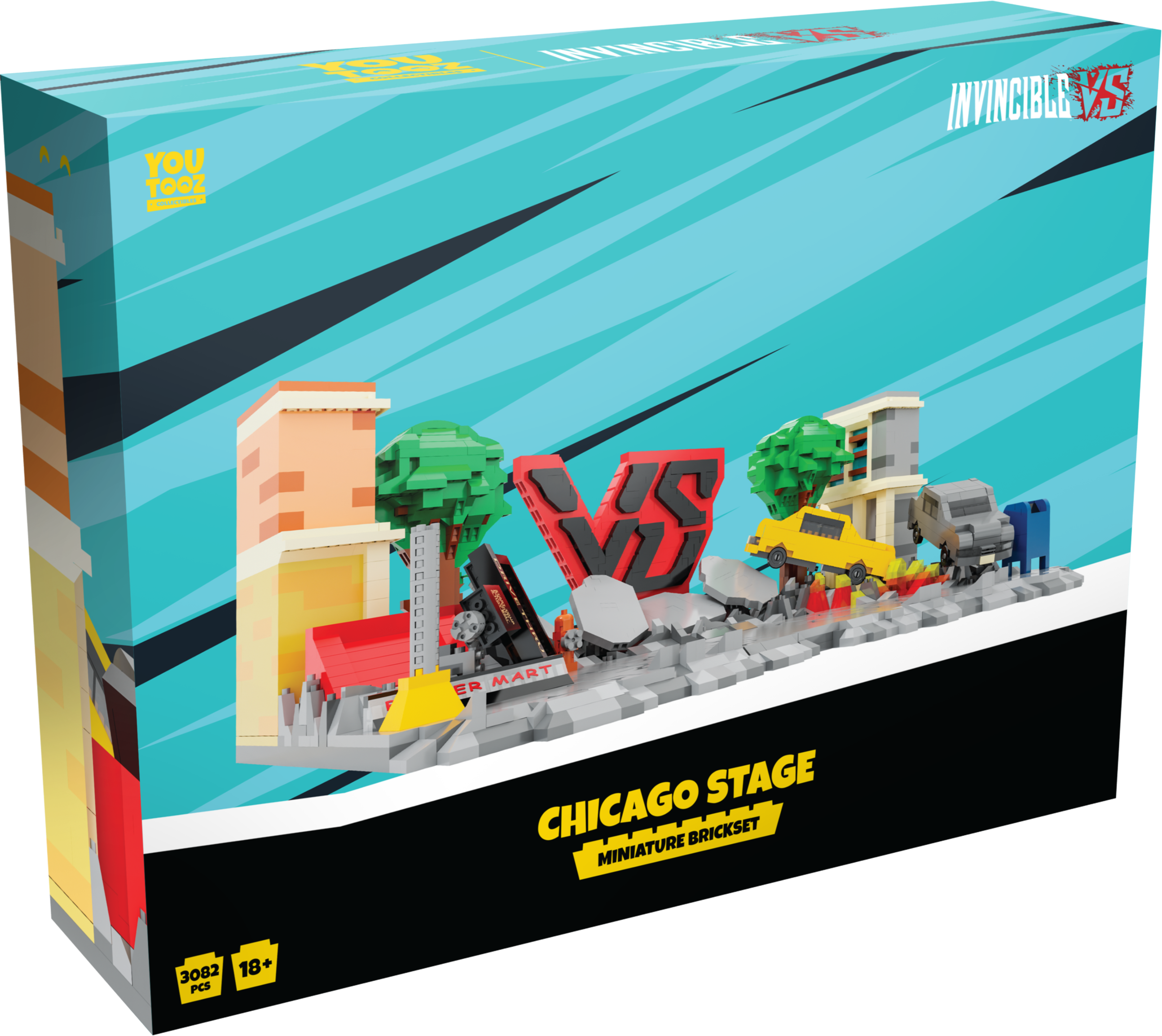 It’s time to choose your fighter and obliterate the opposition, one block at a time, with this expertly crafted brickset of the Chicago Stage from Invincible VS! With thick cracks running along the arena’s grey road and large segments of concrete jutting out from the back as a red and black ‘VS’ logo sits between tall trees and destroyed shopfronts, the debris of a ruined Burger Mart drive-through lay to the left side with its fallen sign resting in front of a toppled roof while a yellow and grey car have been flung to the right from the force of the fight with vibrant red and yellow flames curling underneath their wheels. Consisting of 2,927 pieces and measuring in at 14.3” x 7.9” x 4.8” with an expertly written instruction booklet to help you build your very own piece of Invincible VS as the perfect backdrop for your Invincible Youtooz or anyone else who’s brave enough to take them on!
