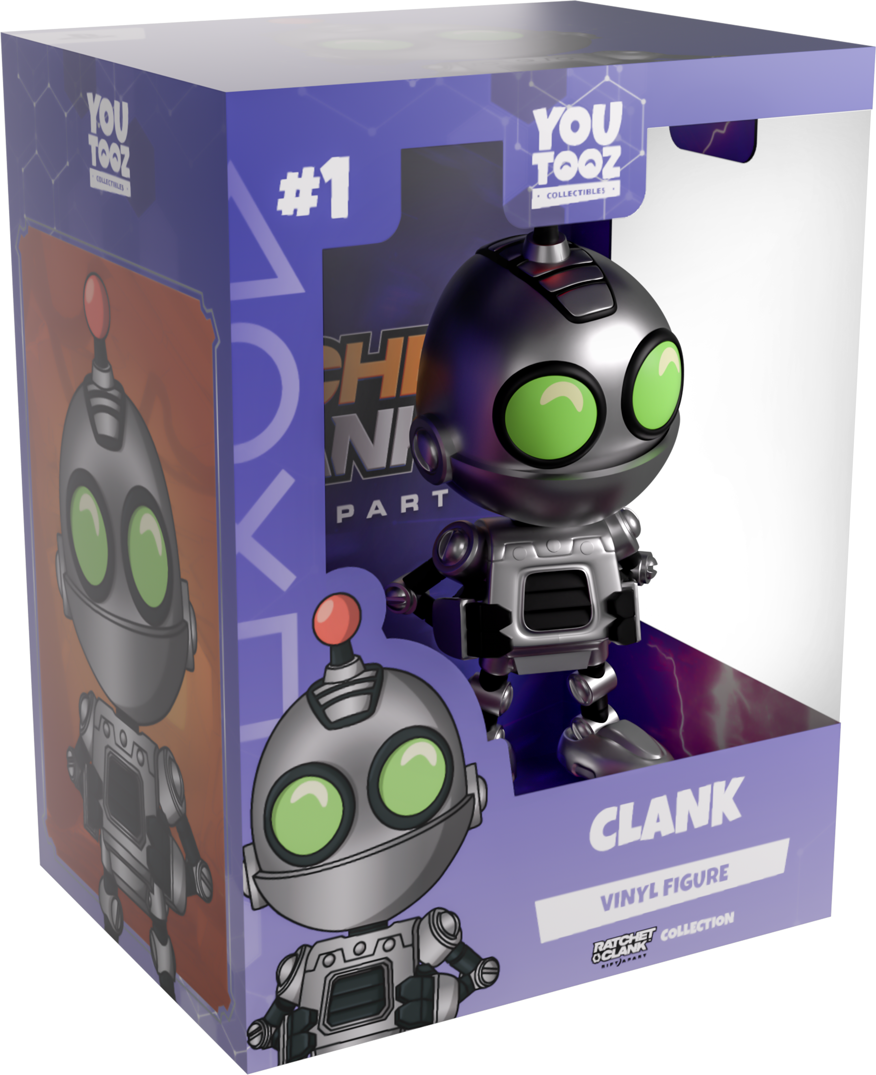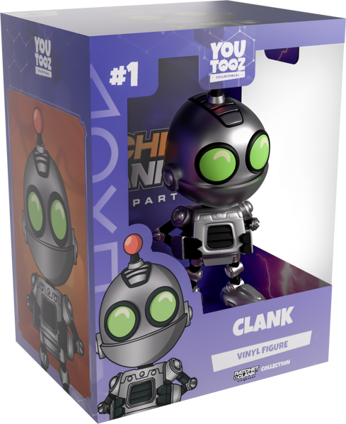 Clank’s repaired the Dimensionator and has warped into Youtooz for their debut! Standing at 4.3 inches tall with small two-fingered hands resting on their hips and a pair of bright green eyes shining out from their silver chrome head, a small antenna with a red ball tip pokes out from the top as a black vent rests on their chest and round joints connect thin limbs to long round feet. The exterior of his packaging sees them jumping out of a purple rift. While the interior is a spiralling white vortex that shoots strands of electricity over a deep purple background, the protective sleeve is a dark blue with a metal plate across the bottom as his figure can be seen through the large clear window at the packaging’s front. This collectible ships in a matte, embossed, protective outer sleeve and a custom-sized plastic protector for maximum protection during shipping