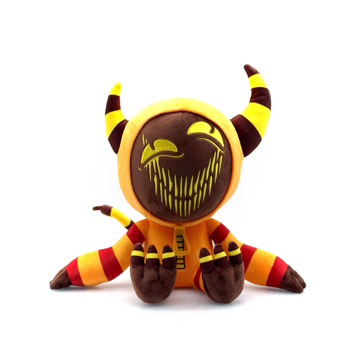 The seasons are changing and Halloween is on the horizon, so we've brought our favorite Veldigun, Clyde, to life as a 9 inch Youtooz plush! This demon is seated with long legs kicked forward and arms relaxing lazily to each side as orange and red stripes reach down each limb to his dark fingers and toes. Wearing his iconic orange hoodie that comes up to cover his head and frame a ghoulish smile, two black and yellow horns poke out from the top to match the spikey tail flicking out from his back! This plush is packed to the seams with 100% PP cotton and is made of the softest minky material with accents of felt, perfect for cuddling or scaring people with!