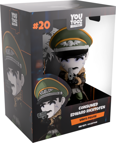 Edward Richtofen has returned to Youtooz! But he’s looking a little different… Is he ok?! Standing at 4.2 inches tall and staring down the barrel of the grey pistol held to his front in gloved hands, concentration fills his pale vein-covered face as dark eyebrows furrow to match the thick moustache over his frowning mouth. Wearing a green officers cap with a grey cord over its black brim, his long black trench coat is tattered at the end as brown fur lines the neck and cuffs, and green pants tuck into his black boots. The exterior of his packaging is covered in a grey hexagonal pattern with bright orange highlights, while the interior is filled with a warping dark camouflage. The hexagons then continue onto the protective sleeve that has grainy vertical blue and orange stripes, as his figure can be seen through the large, clear window at the packaging’s front. This collectible ships in a matte, embossed, protective outer sleeve and a custom-sized plastic protector for maximum protection during shipping.