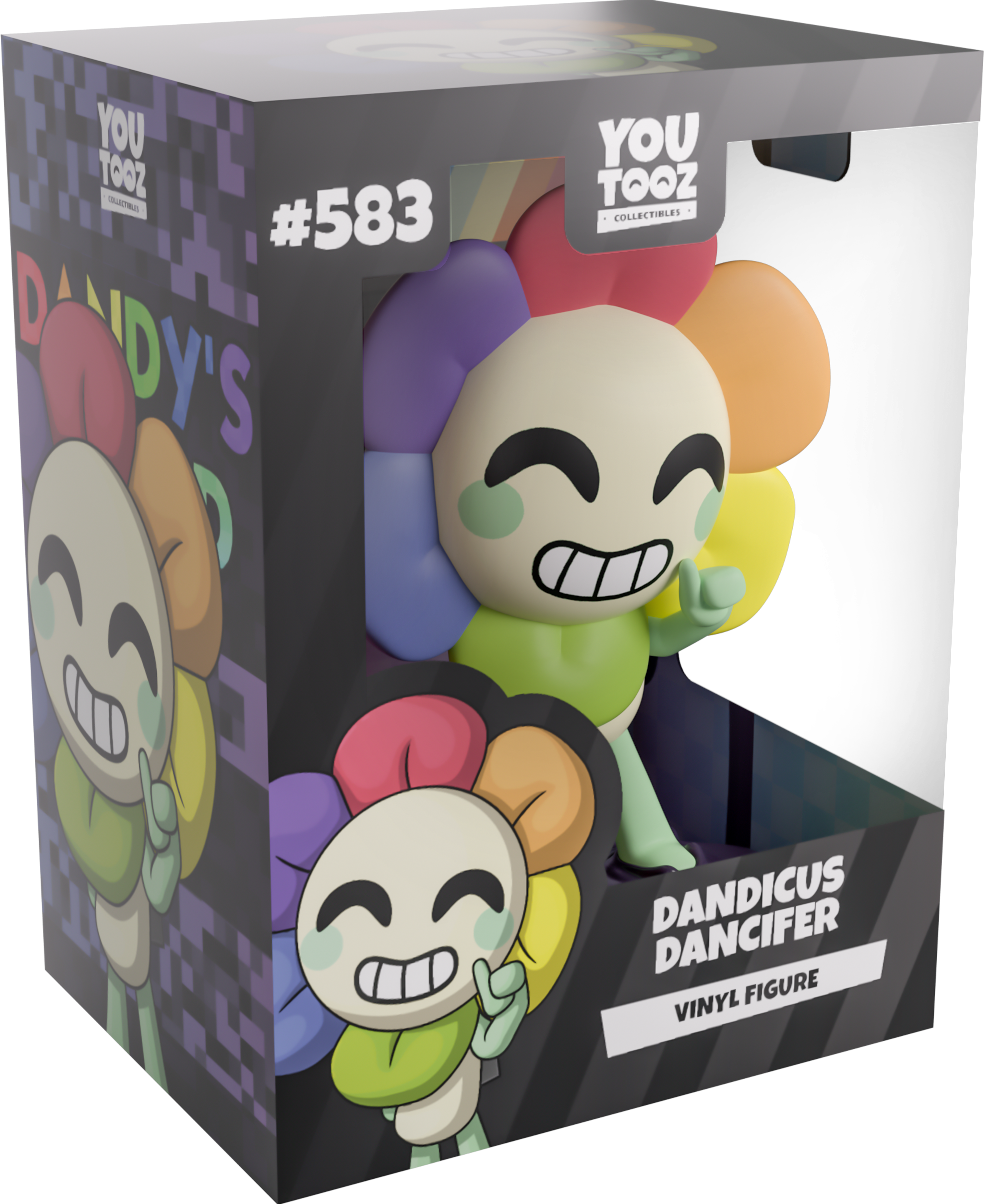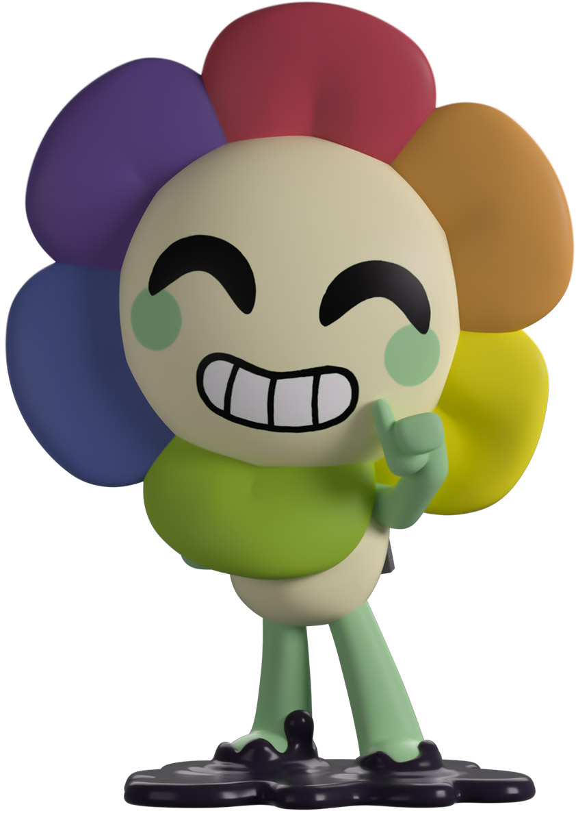 Dandy's got some new stock in his store, it's his very own Youtooz! Standing at 4.5 inches tall with their left hand curling forward and a finger pointing upwards, a huge smile beams across their face as blushing green cheeks sit under cheery eyes. With multicolored petals surrounding their head, they hold a VHS tape behind their back that drips with the same black goo covering his feet. The exterior of his packaging has been illustrated to showcase Dandy's irate face on a screen behind a shop counter. While the interior is covered in a multicoloured checkerboard pattern which makes its way onto the protective sleeve as his figure can be seen through the large clear window at its front. This collectible ships in a matte, embossed, protective outer sleeve and a custom-sized plastic protector for maximum protection during shipping.