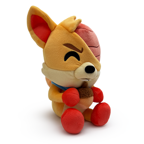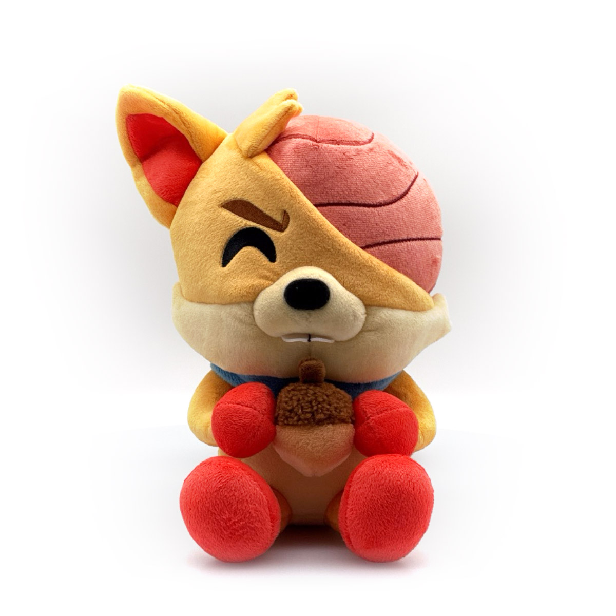 It’s.. It’s… IT’S ALIIIIVE!! Wait, no it’s not… It’s dead… That’s not stopping him from returning to Youtooz for his plush debut, though! Sitting at 9 inches tall and holding the most precious acorn in his red hands as buck teeth hang from a light muzzle, his orange head has been cleaved diagonally to reveal a sectioned pink brain as a pointed ear pokes out from his remaining skull. With his singular eye casting a cheeky look and a blue scarf tied around his neck, red feet kick forward as a fluffy tail curls out from the back. This plush is packed to the seams with 100% PP cotton and is made of normal and long pile minky materials with accents of felt, absolutely perfect for cuddling or gaming with!