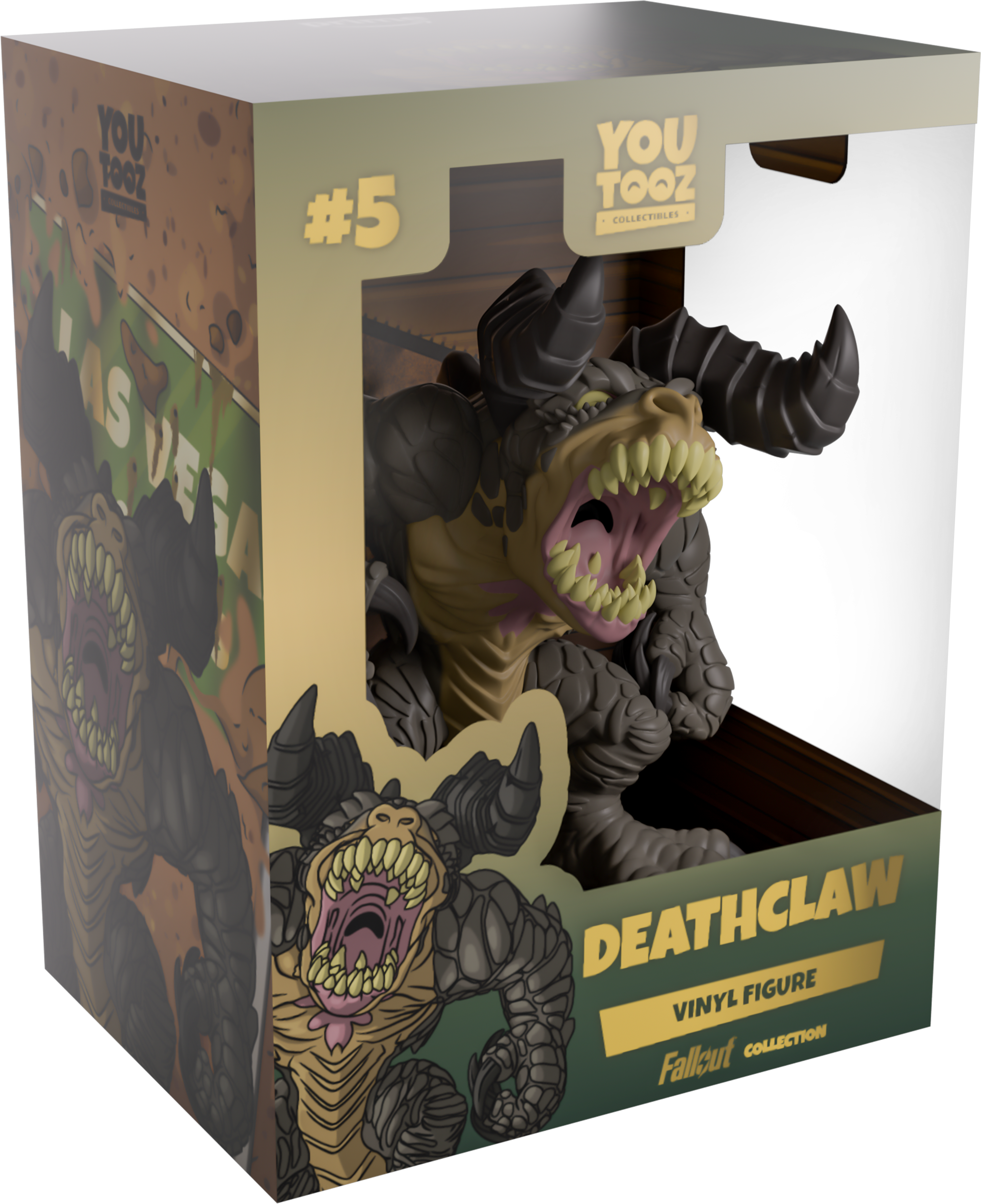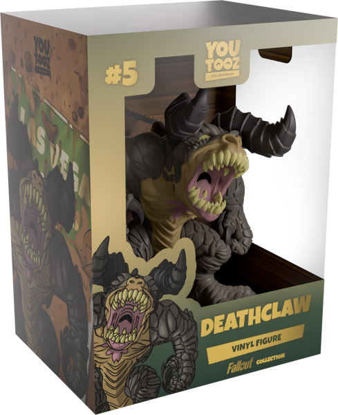 You may think you could survive the wasteland, but you’ve never seen a Deathclaw! Well, if you had seen a Deathclaw, then it would probably be too late anyway… Hulking in at 4.6 inches tall with a tooth-filled mouth opening up to let out a horrific bellow, brown nostrils flare out in front of piercing eyes as a pair of thick horns curl out from either side of their ravenous head. Opening their right hand as they prepare to unleash a deadly swipe with their sharp claws, thick scales cover their muscular body as jagged spines run down their back onto the thick tail curling around their feet. The exterior of their packaging looks down a sandy path towards New Vegas, while the interior is filled with dark brown wood paneling. The protective sleeve then sees a brown silhouette of the treacherous wasteland as their figure can be seen through the large, clear window at the packaging’s front. This collectible ships in a matte, embossed, protective outer sleeve and a custom-sized plastic protector for maximum protection during shipping.