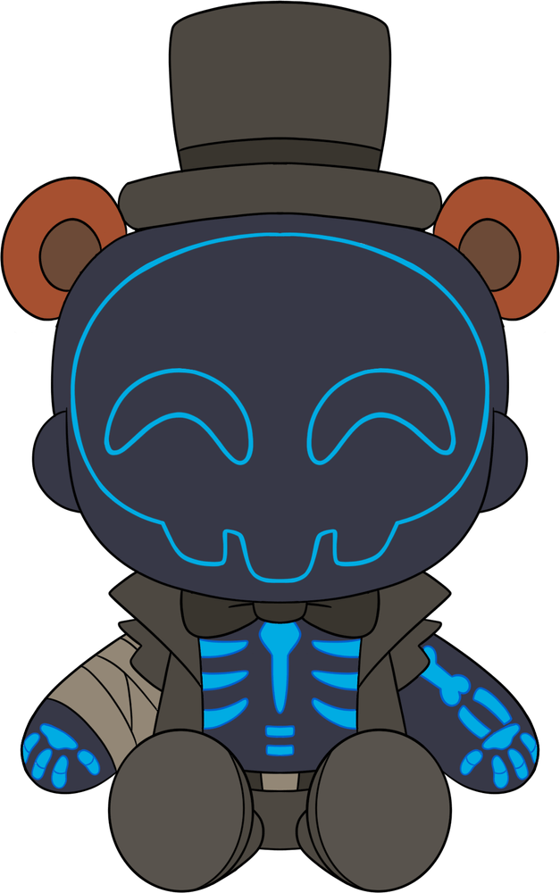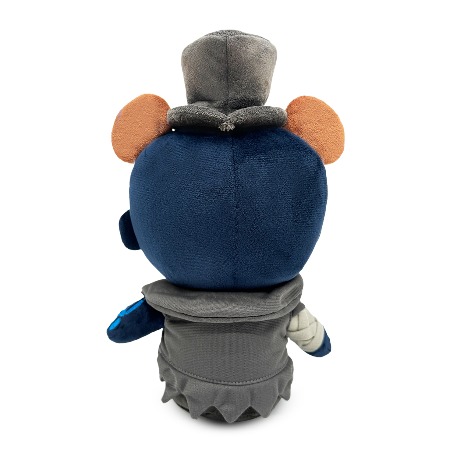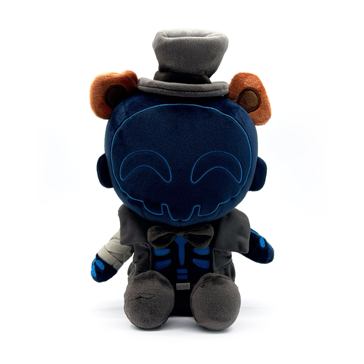 Freddy loves to sing, so this mashup was a match made in heaven! The Living Tombstone and FNAF team up with us for this brand new Youtooz plush. Sitting at 9 inches tall with his legs kicked forward and wearing a tattered brown suit that's open at the front to reveal a neon blue skeleton, their right arm is wrapped in bandages as a dark bowtie rests under their chin. With a grey top hat resting atop their head between a pair of round brown bear ears, a neon blue skull shines out from their dark face thats matches the bones on their arms. This plush is packed to the seams with 100% PP cotton and is made of the softest minky material with accents of felt, perfect for cuddling or writing music with!