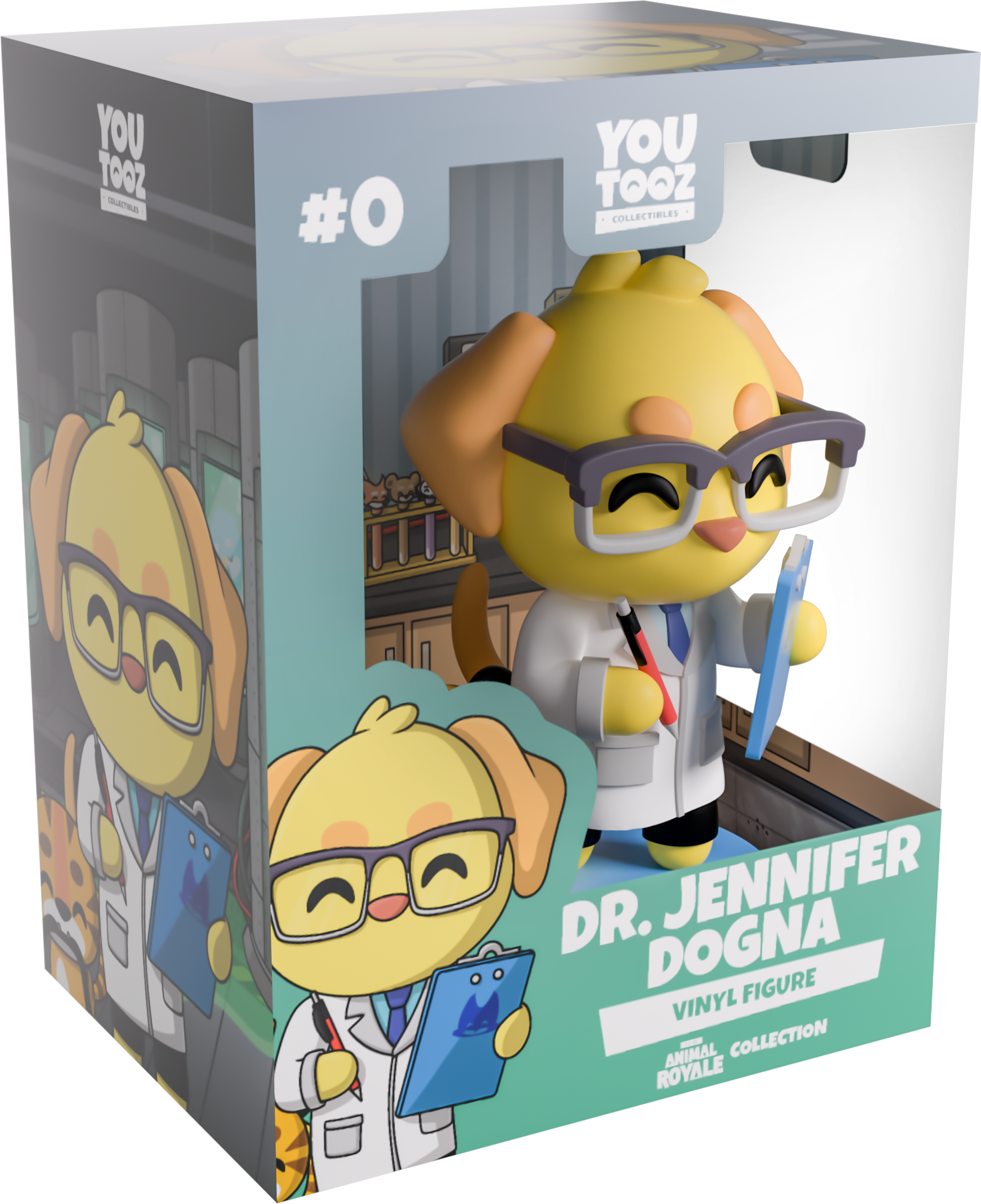 Behold, the smartest pup in all the land, turned into a Youtooz figure! Standing at 4.5 inches tall, this helpful "dogtor" is dressed in a long white lab coat with a blue tie neatly tied underneath. Underneath she is wearing black pants and is accessorized with gray rectangular framed glasses on her face. In her left hand she is holding a blue clipboard while in her right hand she has a pen. To her right stands Mini Tiger with a ripped cable in her mouth. The exterior of the windowed display box shows a room filled with chemistry experiments and lab equipment. The interior is an experiment room filled with large tubes with cute little creatures incubating inside. This collectible was designed in collaboration with @therealracckun and ships in a matte, embossed, protective outer sleeve and a custom-sized plastic protector for maximum protection during shipping.