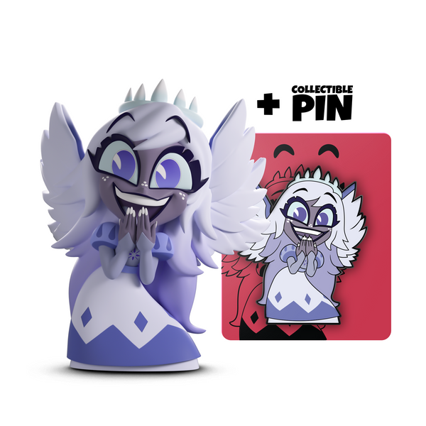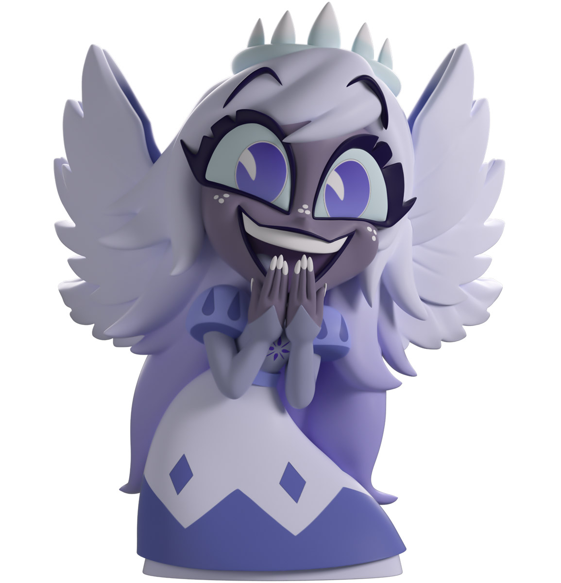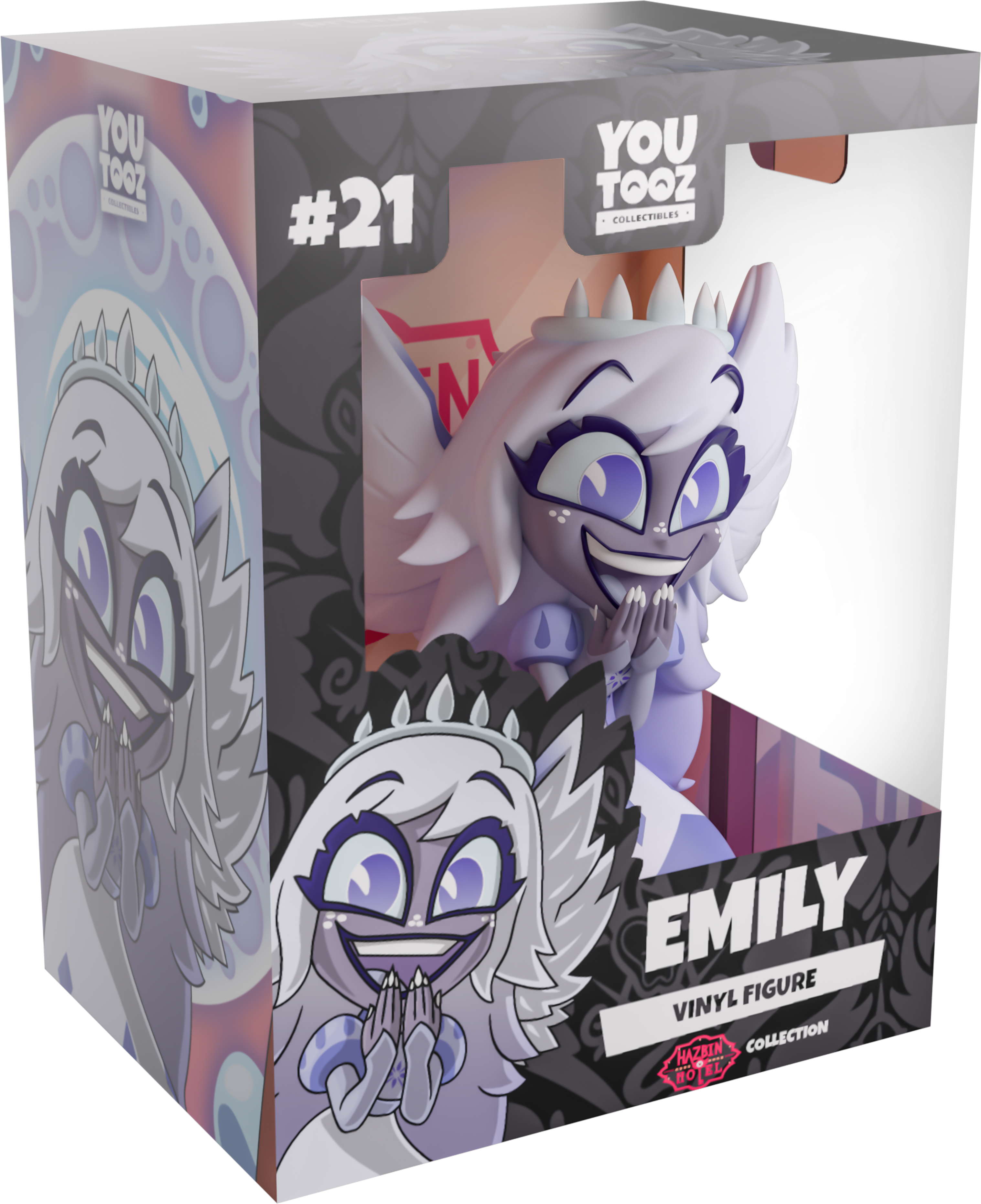 Emily’s arrived at Youtooz to be the most super fun, silly and very cool friend you could ever ask for! Standing at 4.8 inches tall and leaning forward as she lets out an excited yell and raises her hands in front of an ecstatic open mouth, white freckles mark her cheeks and nose under a pair of huge purple eyes as a light green and halo rests on her long, purple-tipped white hair. With a pair of pointed wings extending from her shoulders, she wears a purple and white dress with dark sleeves that come onto her hands and rounded shoulders. The exterior of her packing looks into a gold and white room with glowing blue orbs, while the interior sees a pastel orange and pink skyline filled with rounded buildings. The protective sleeve is then designed to show off a dark cityscape as her figure can be seen through the large, clear window at the packaging’s front. This collectible ships in a matte, embossed, protective outer sleeve and a custom-sized plastic protector for maximum protection during shipping.