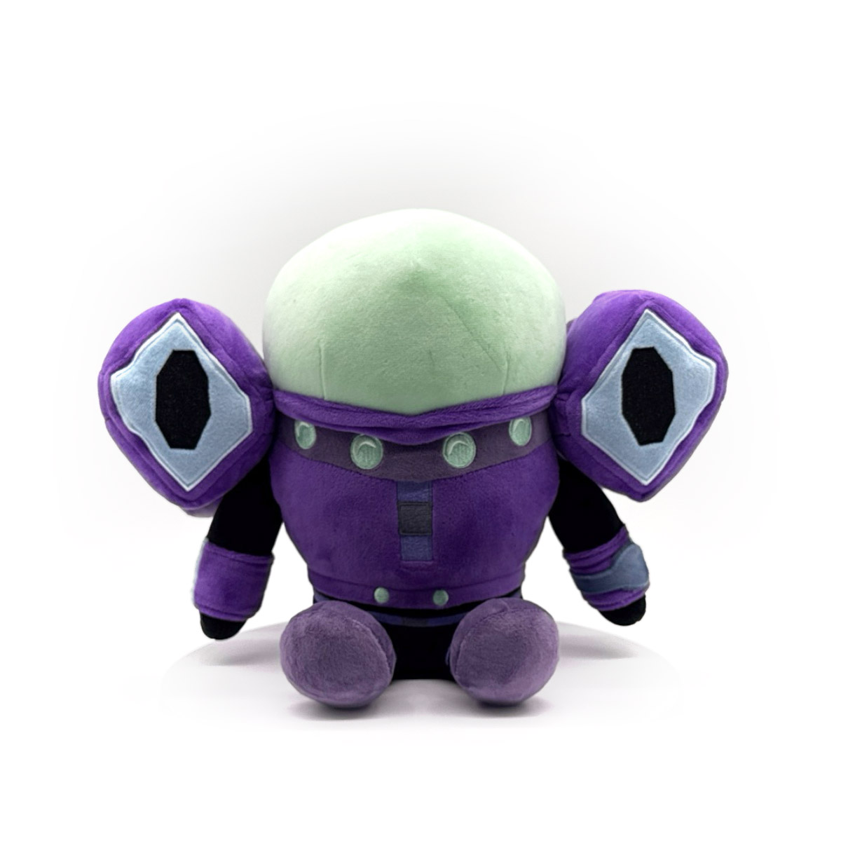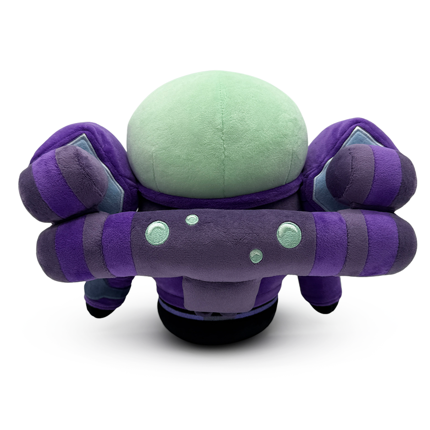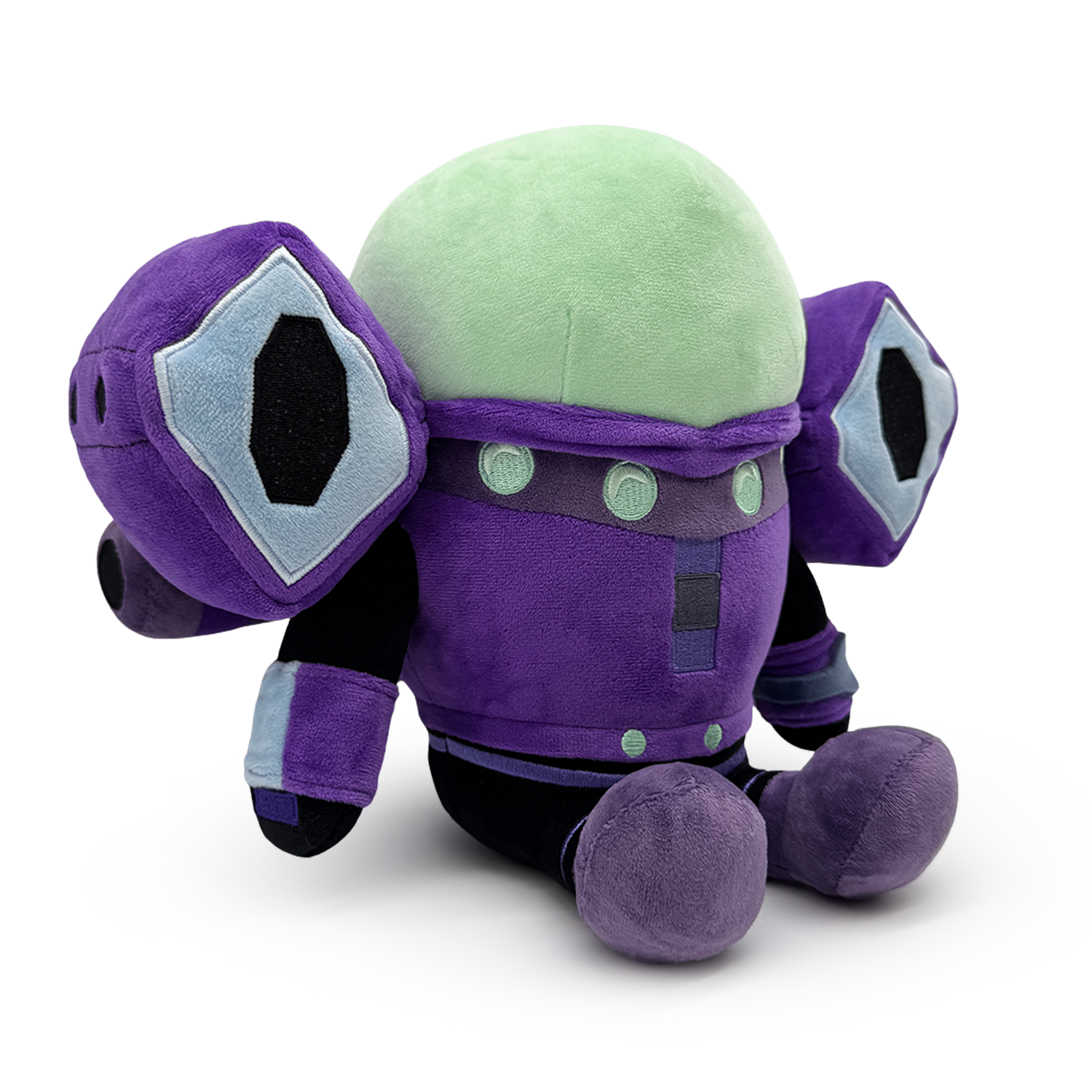 Hunker down and get ready for a fight! The Engineer has arrived to blast his way through this world! Sitting at 9 inches tall with a pale green space helmet covering his head, a pair of thick diamond cannons extend from the hulking mechanism on his back to wrap over each shoulder. With deep purple armor that’s covered in grey trim and green orbs that match the panel on his left wrist, his legs kick forward lazily as he takes a break from the fight. This plush is packed to the seams with 100% PP cotton and is made of the softest minky material, absolutely perfect for cuddling or setting up defenses with!