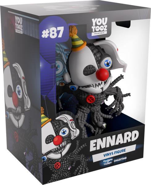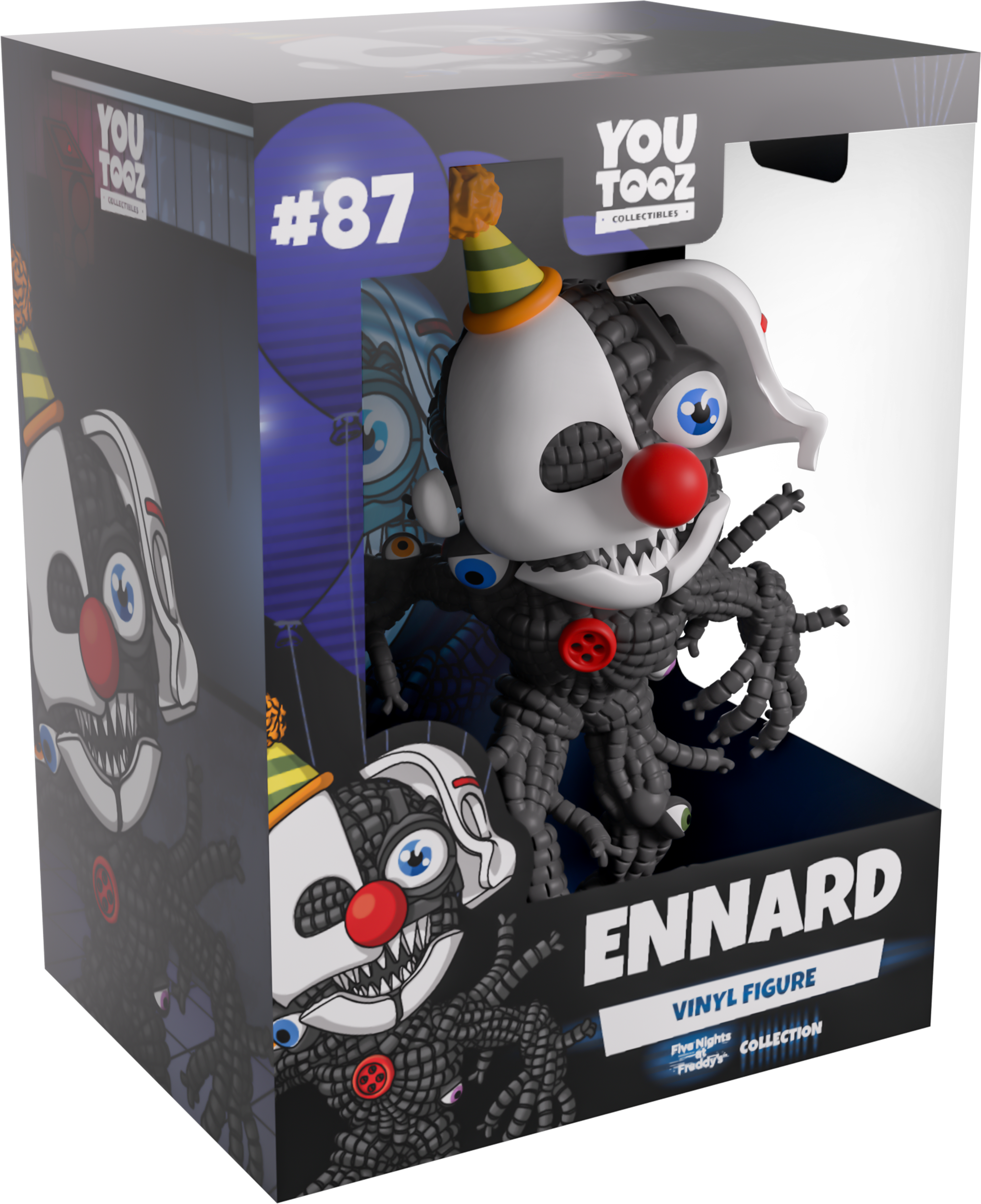 Ennard has returned to Youtooz, and he’s looking for some revenge with his vinyl debut! Shambling forward at 4.6 inches tall with his white face splitting apart into four sections, a round red nose rests above his horrific, sharp smile as a striped green and orange party hat tops his head. With a mass of curling and twisting dark grey wires making up his cobbled body, a red button sits at the center of his chest as a series of colored eyes poke out from his writhing torso and limbs. The exterior of his packaging has a pile of discarded body parts lying on the tiled floor, while the interior sees them peering right at you through the darkness. The protective sleeve then showcases a room filled with pipes, vents and jagged paneling as their figure can be seen through the large clear window at the packaging’s front. This collectible ships in a matte, embossed, protective outer sleeve and a custom sized plastic protector for maximum protection during shipping.
