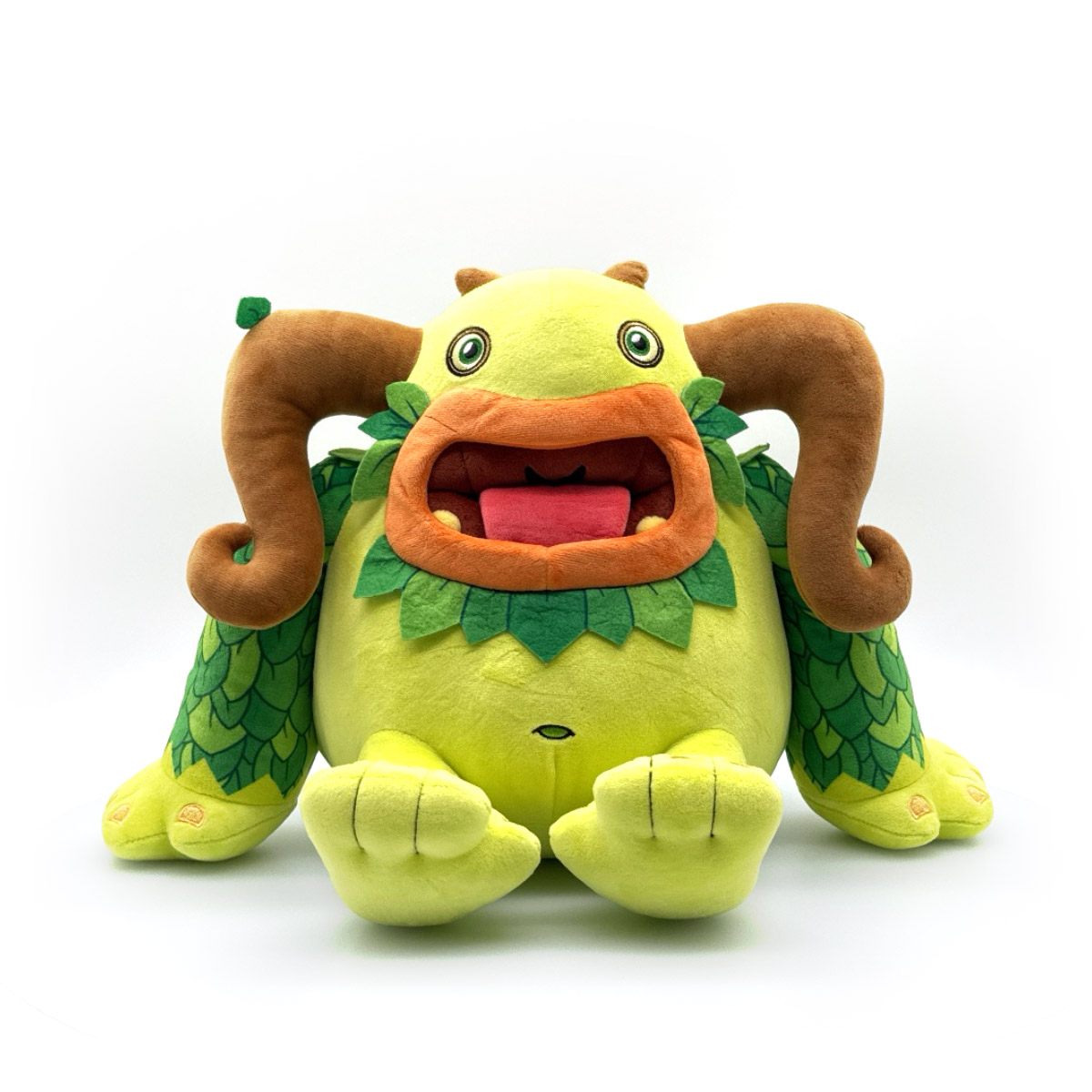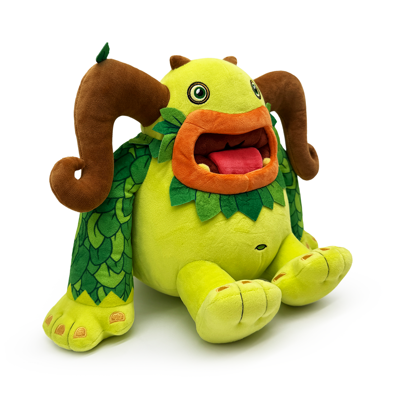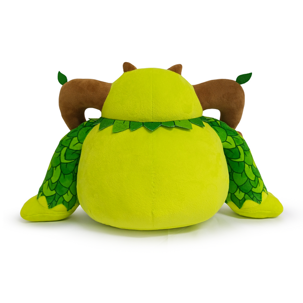 Can you feel that vibrating hum? It could only be an Entbrat arriving at Youtooz! Sitting at 9 inches tall with a huge open mouth that reveals a pink tongue and a pair of blocky teeth, small, round eyes rest on their pale green face under a pair of short brown horns, as long curling ones extend from either side. With a veil of leaves surrounding their neck and covering the thick arms that rest beside a sturdy body, their legs kick forward with chunky feet sticking up towards the sky. This plush is packed to the seams with 100% PP cotton and is made of the softest minky material with accents of felt, absolutely perfect for cuddling or busting out some sweet notes with!