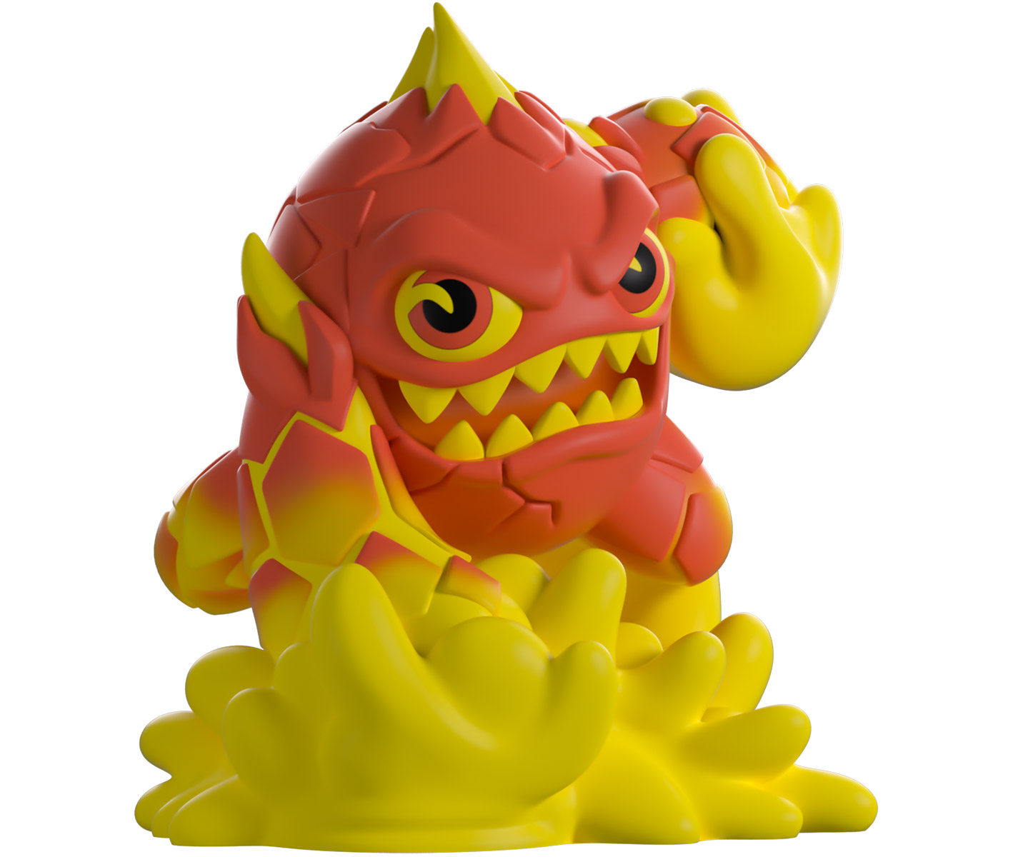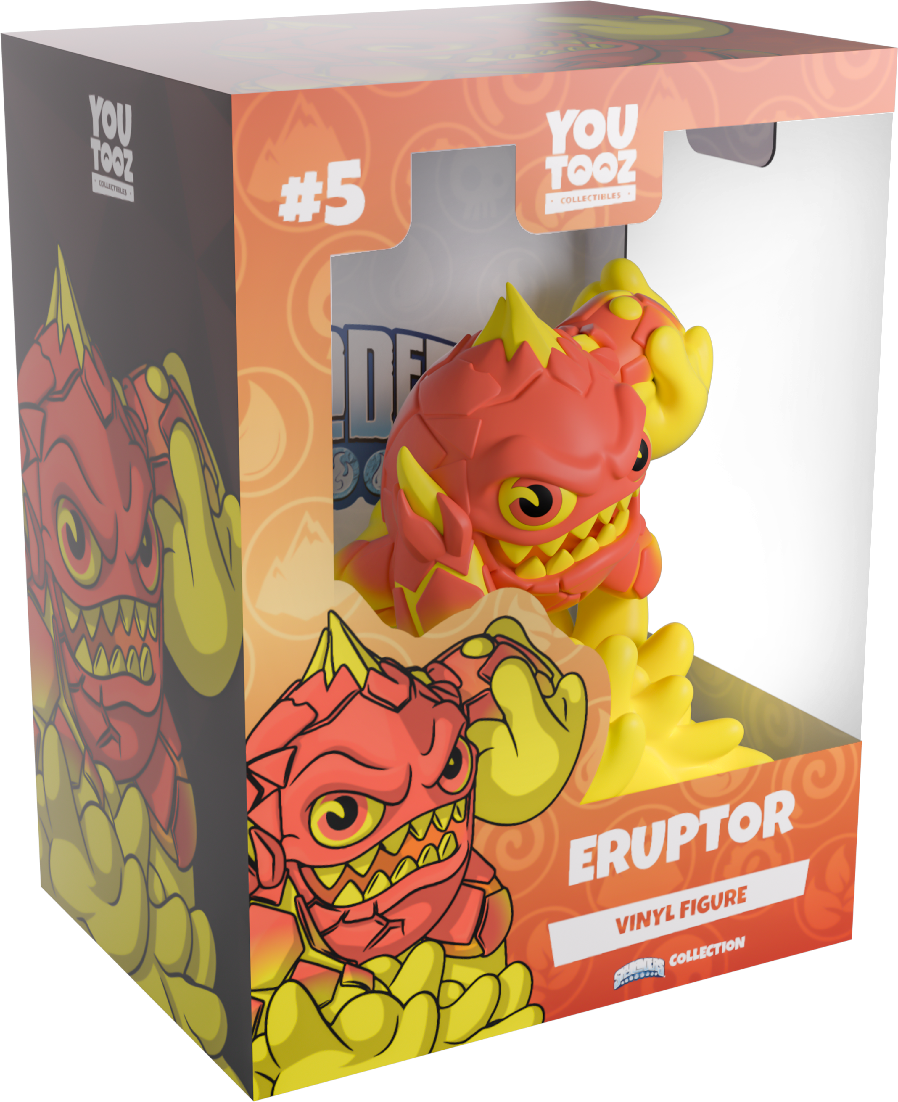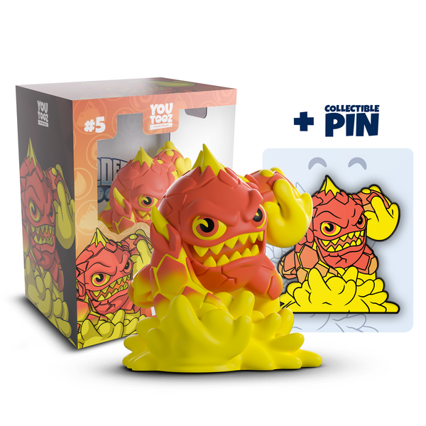 Eruptor has, well, erupted into Youtooz for their vinyl debut! Throwing their body forward at 3.3 inches tall as they slam a fist into the ground at their front, thick yellow lava spews from underneath them in devastating thick tendrils ready to burn away anything in their path. With a fiery red body that’s covered in thick plates and intense eyes staring out from above a tooth-filled smile, a spike of lava points out from the top of their head as they pull their right hand back to unleash another heated blow. The exterior of his packaging sees him surrounded by hot magma and dark brown rocks. While the light interior is covered in white circles that show off the different elements, this design then continues onto the protective sleeve, where his figure can be seen through the large, clear window at the packaging’s front. This collectible ships in a matte, embossed, protective outer sleeve and a custom-sized plastic protector for maximum protection during shipping.