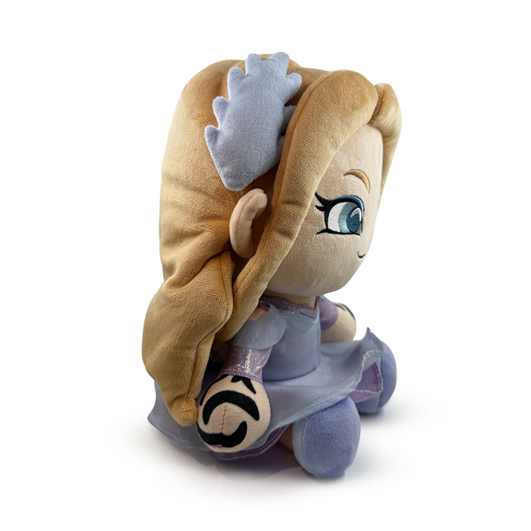 Feyre has travelled through the lands of Prythian to arrive at the court of Youtooz for her magical plush debut! Sitting at 9 inches tall with bright blue eyes that have thick lashes and a thin smile crossing her pale face, her long golden hair curls in front of pointed ears and falls down her back as a light crown wraps around her head. Adorned in a shimmering dual layered blue dress with exposed shoulders and matching shoes, dark swirling magical tattoos cover her hands and run up each arm. This plush is packed to the seams with 100% PP cotton and is made of minky, normal and transparent shimmer materials, absolutely perfect for cuddling or breaking curses with!