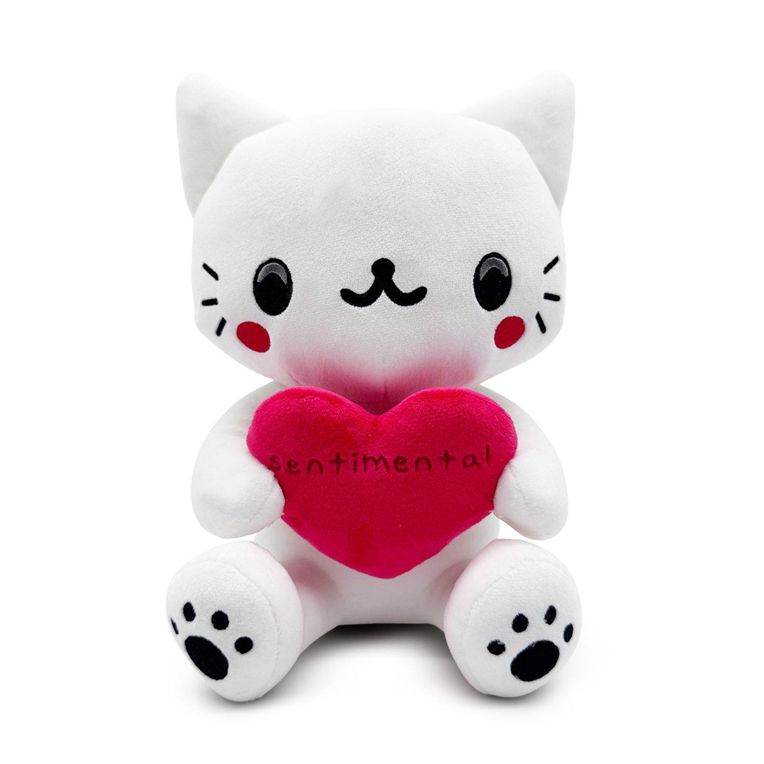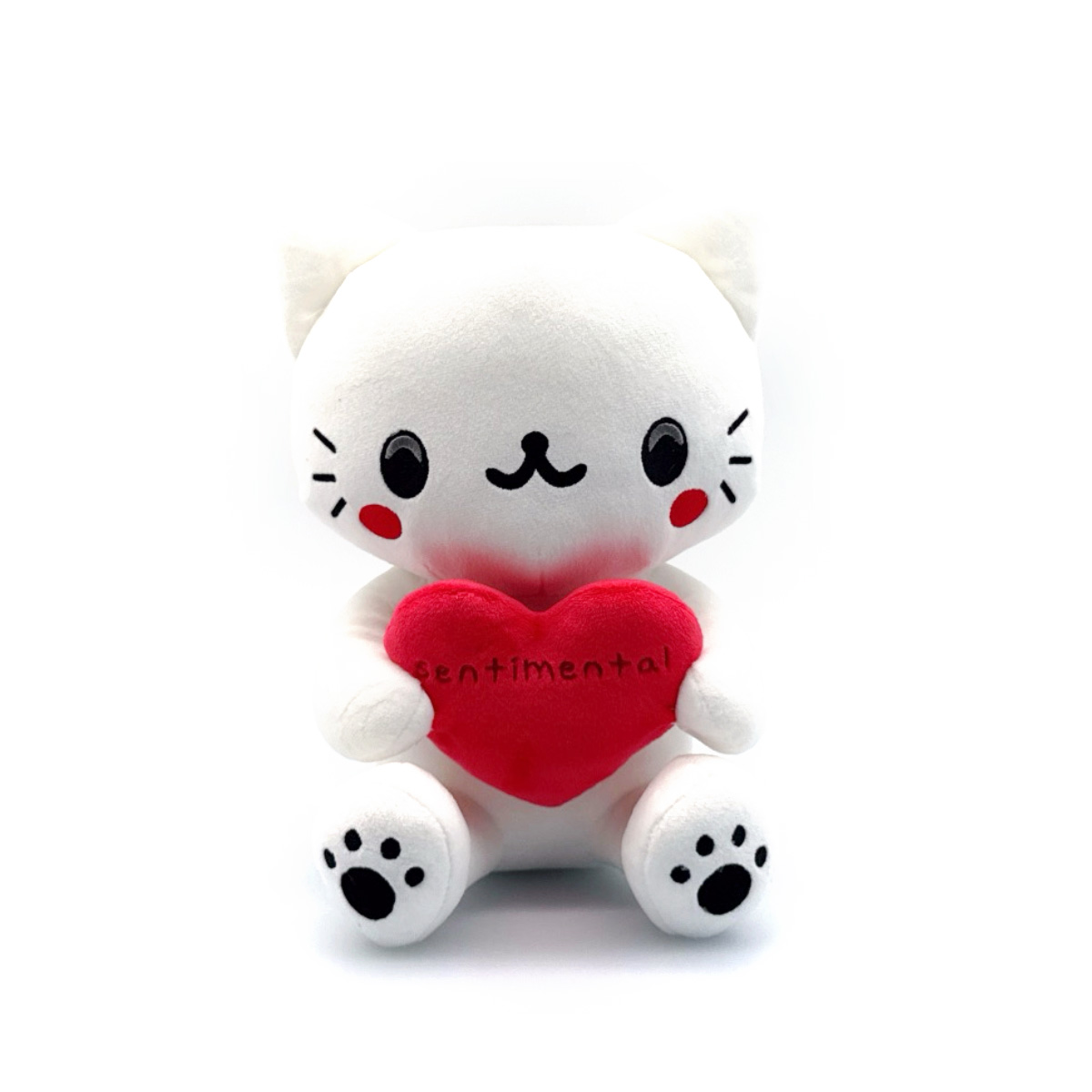 Get ready to feel sentimental with our new plush! Gatito Sentimental is ready to share their heart with you! Sitting at 9 inches tall with their legs kicked forward as blushing red cheeks shine under round black eyes, the most adorable smile rests at the center of their face as a pair of pointed ears poke out from the top of their head, and they hold a bright red heart to their chest with a long tail curling out from their back. This plush is packed to the seams with 100% PP cotton and is made of the softest minky material, absolutely perfect for cuddling or feeling the love with!