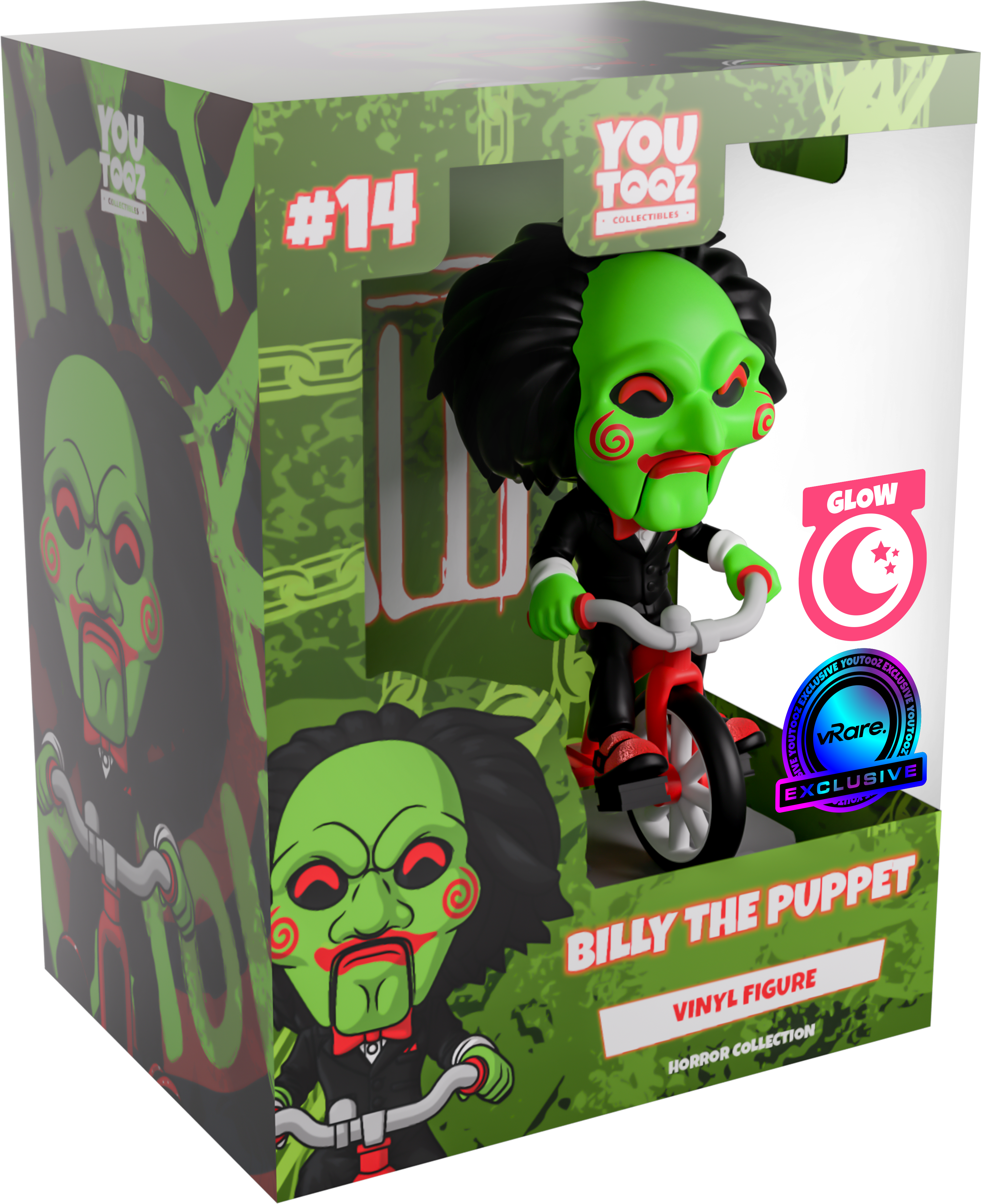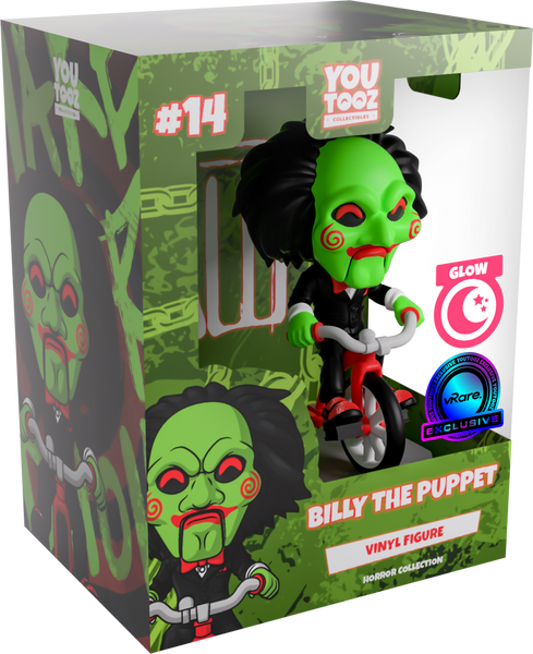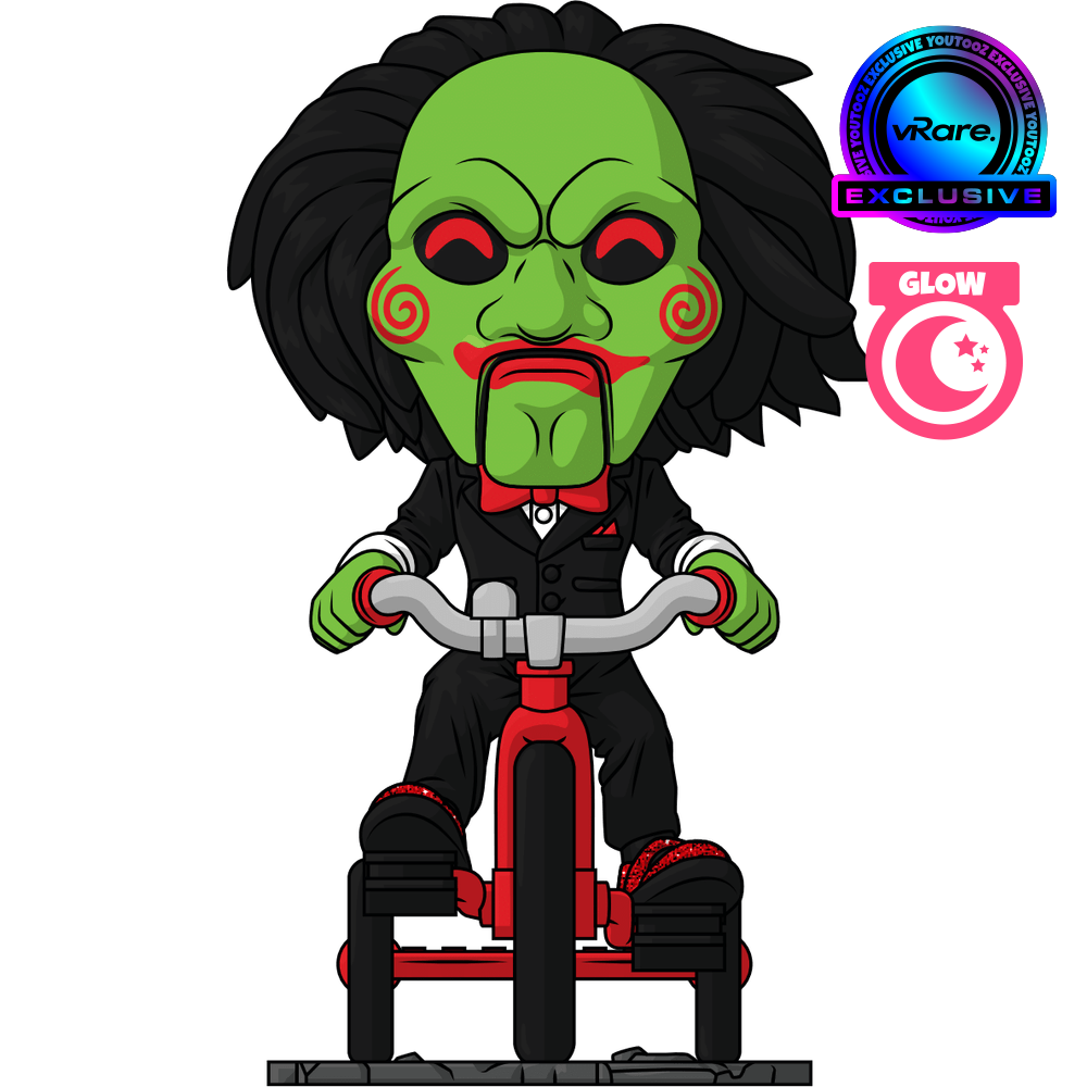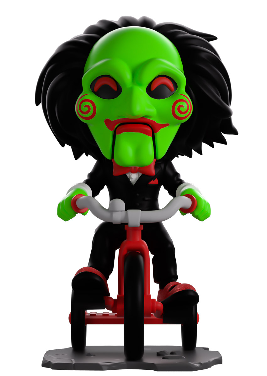 Now this is one game we definitely want to play as Billy the Puppet makes their Youtooz debut... in glow in the dark form! Ready to give you the ultimate challenge and riding in atop a bright red and grey tricycle at 5.2 inches tall with his green-gloved hands gripping the handlebars and a sparkling red shoe on each pedal, his long black hair sweeps back from a green mask as bright red pupils shine out from under a thick brow. With spirals on each cheek and the lines of his puppet mouth carved around bright red lips, he wears a slick black suit over a white shirt and red bowtie. The exterior of his packaging is black and blood red with a terrifying pig masking staring outward. The interior is covered in a splotchy blood red with a series of chains running across it, these then continue onto the protective sleeve where his figure can be seen through the large clear window at the packaging’s front. This collectible ships in a matte, embossed, protective outer sleeve and a custom-sized plastic protector for maximum protection during shipping.