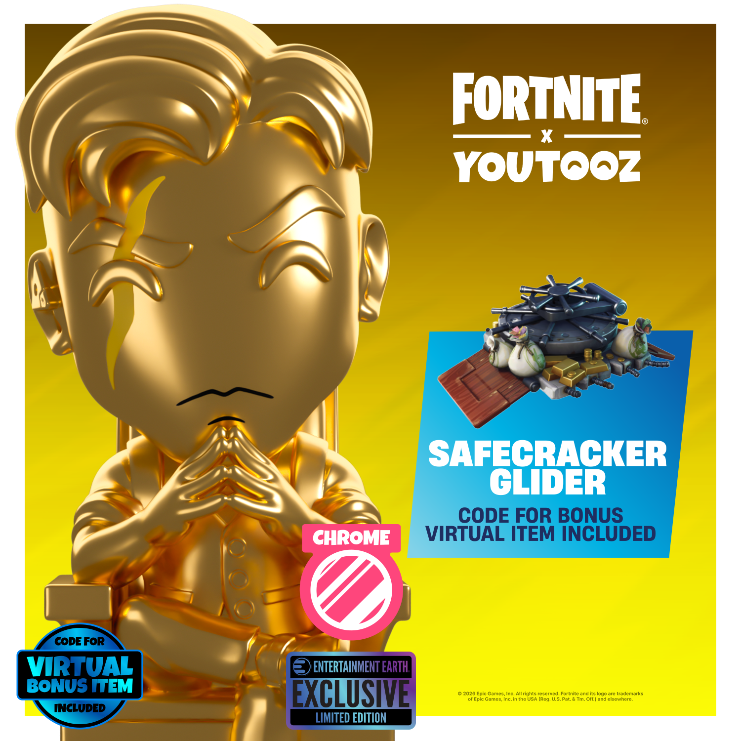 Each Gold Chrome Midas Youtooz includes an in-game content code for a Safecracker Glider. A redemption code card will be included in the box behind the figure and will be redeemable at https://www.fortnite.com/redeem. Limited edition of 333 units.