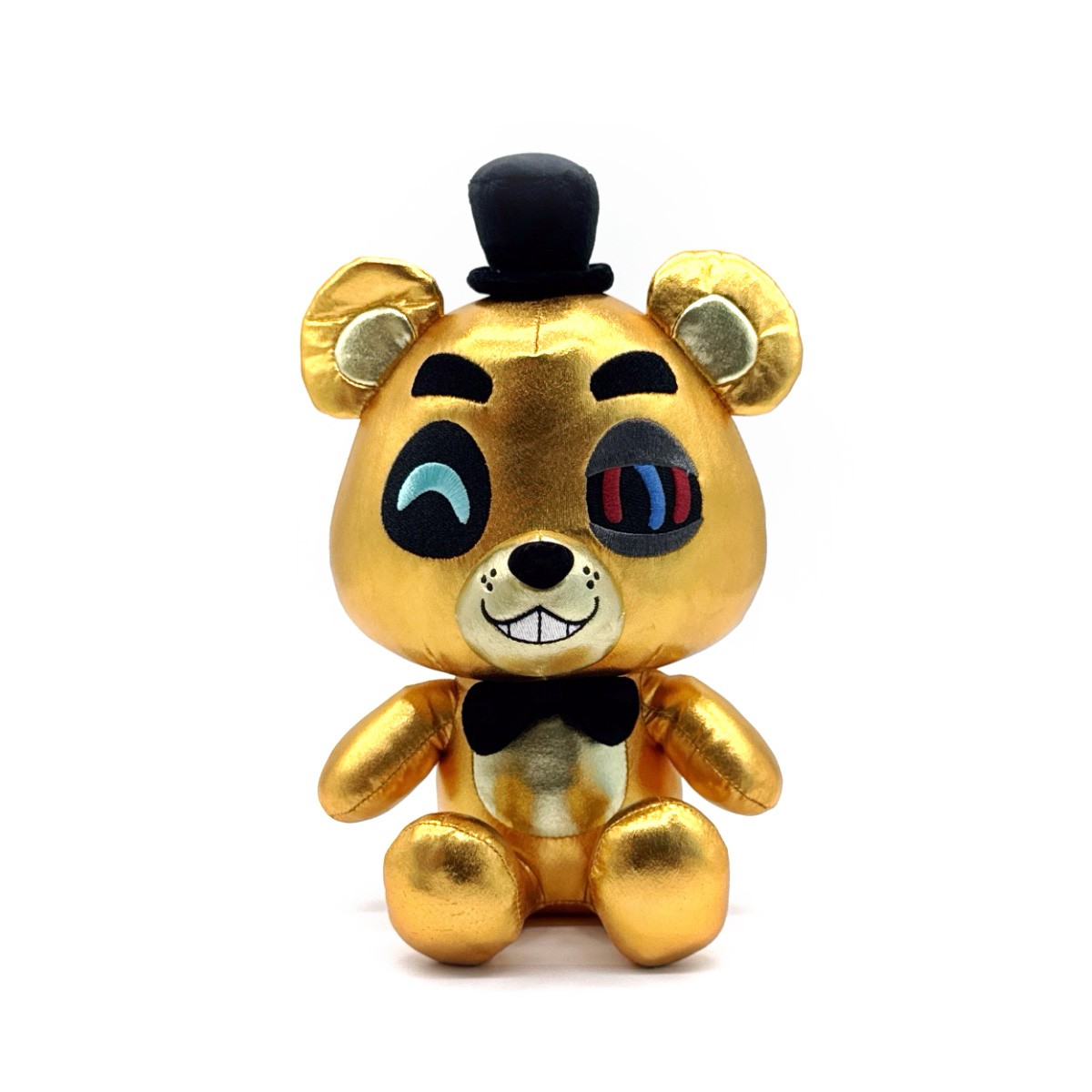 There is no better investment than a solid gold animatronic; take it from us! Freddy's back at Youtooz and he's more golden than ever! Sitting at 9 inches tall with his adorable bear paws kicked forward and dressed sharply with a black bowtie around his neck and a matching top hat between round ears, the grey eyelids on Freddy's left eye frame the internal wires hidden underneath his shiny exterior as a wicked smile crosses his muzzle. This plush is packed to the seams with 100% PP cotton and is made of shiny golden fabric with accents made of the softest minky material, perfect for cuddling or reflecting lights in the dark!