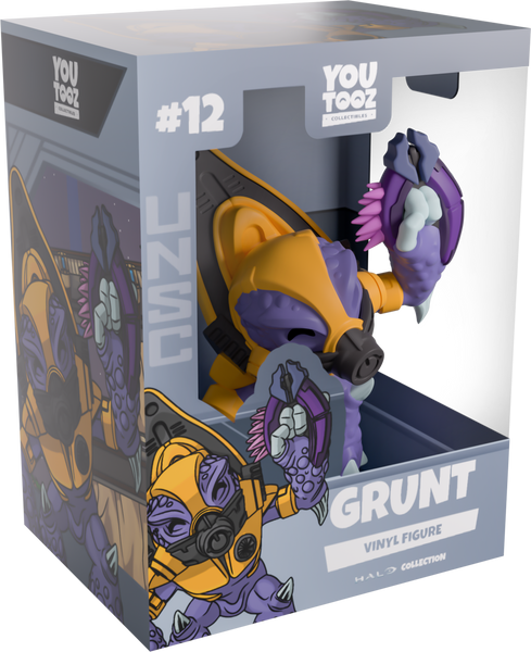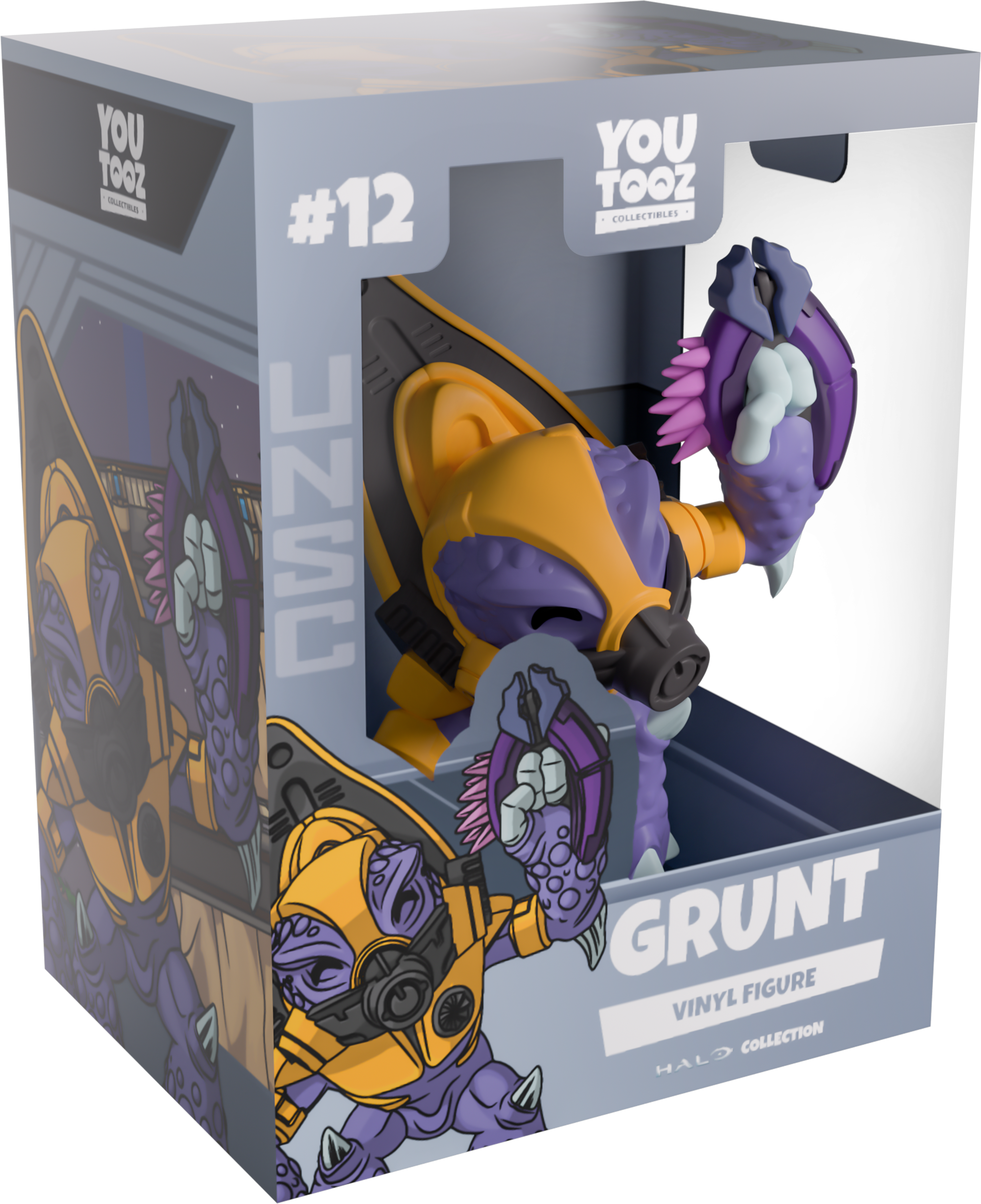 A single Grunt? All by themselves?? Now this will be easy pickings! Standing at 4.2 inches tall with a purple right fist slammed into the ground as they hold a Needler in their raised left hand to taunt a cowering enemy. Bright yellow armor covers their chest and wraps over their head to lead to a raised methane tank on their back, while a grey respirator covers their mouth and spikes extend from the elbows and knees of their scaly purple body. The exterior of their packaging shows a bright blue grenade being thrown from a bridge, while the light grey interior is covered in angled patterns that extend onto the protective sleeve with the UNSC logo as their figure can be seen through the large clear window at the packaging’s front. This collectible ships in a matte, embossed, protective outer sleeve and a custom-sized plastic protector for maximum protection during shipping.
