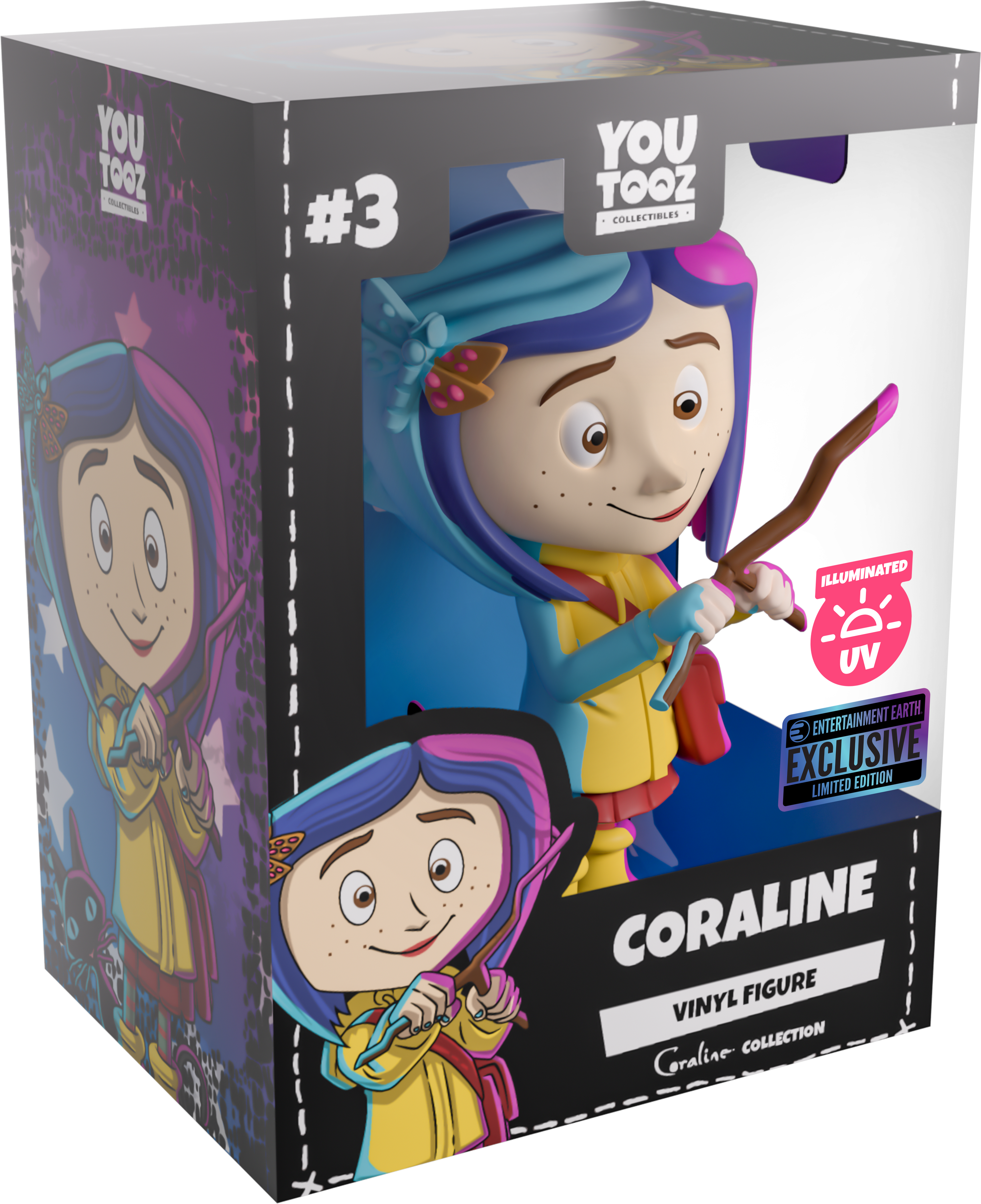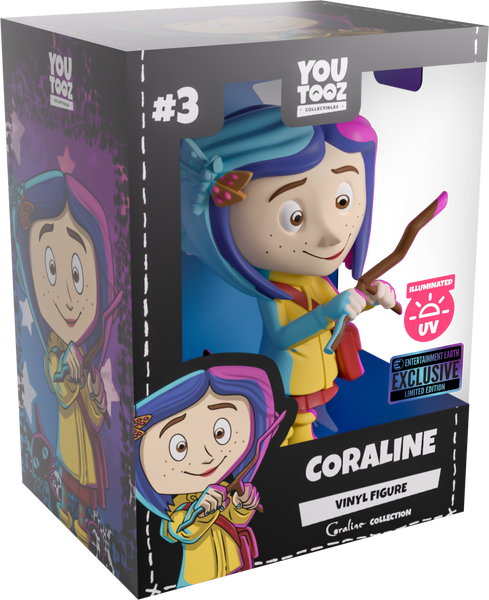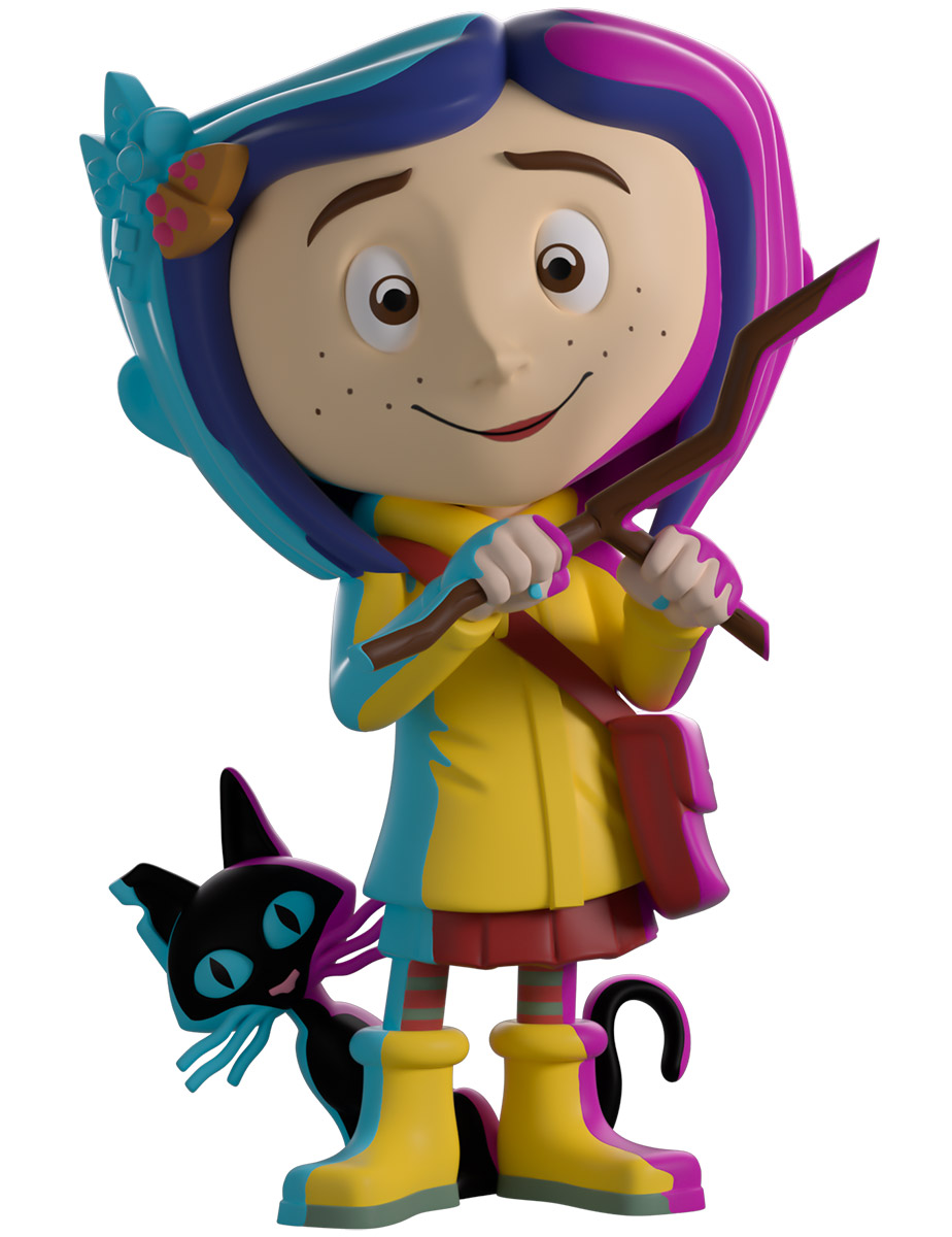 Coraline’s been illuminated by the secrets she found hidden in the Other World! Standing at 4.5 inches tall and bathed in an illuminating blue, yellow and pink as she holds a wooden dowsing rod to her front, an endearing smile crosses her freckled face as shoulder-length blue hair parts in the middle with a dragonfly clip sitting on the right side. Always dressed ready for an adventure, she wears a bright yellow raincoat over a pink dress along with matching gumboots and striped socks as an inquisitive black cat sticks its head around from her side. The exterior of her packaging sees Coraline and the cat going for a stroll in front of a full moon, while the blue interior is covered in white stars. The protective sleeve is then a purple to blue gradient with white stitching running around it as her figure can be seen through the large clear window at the packaging’s front. This collectible ships in a matte, embossed, protective outer sleeve and a custom-sized plastic protector for maximum protection during shipping.