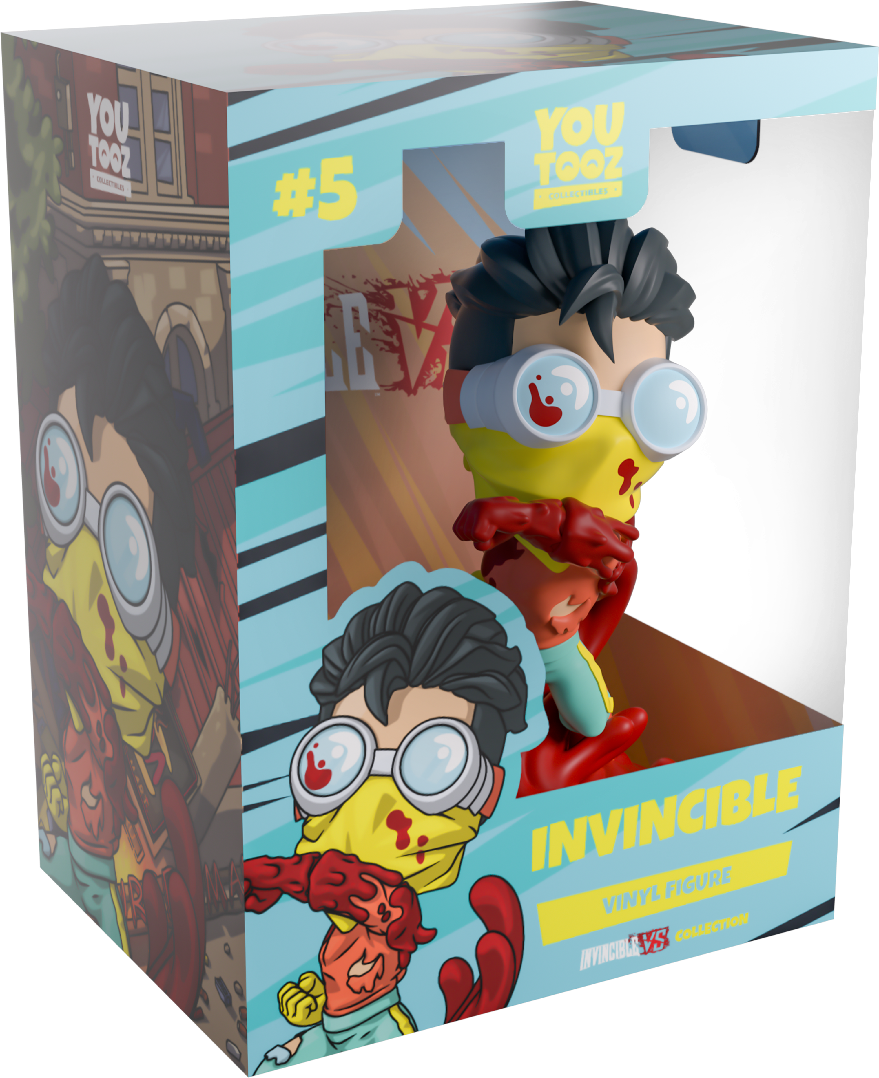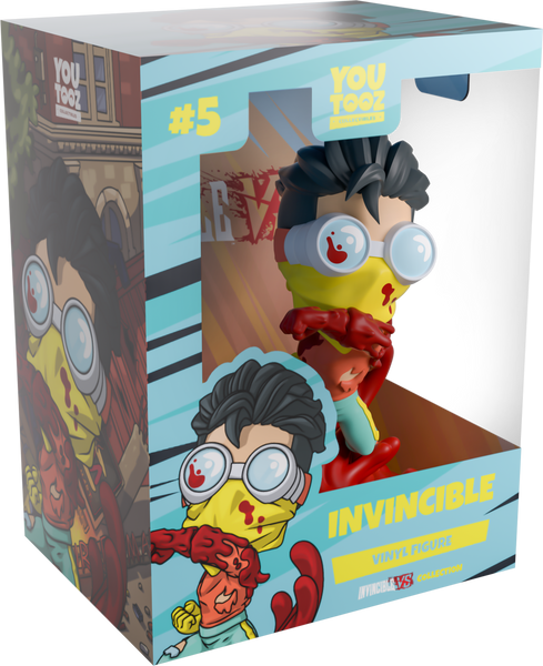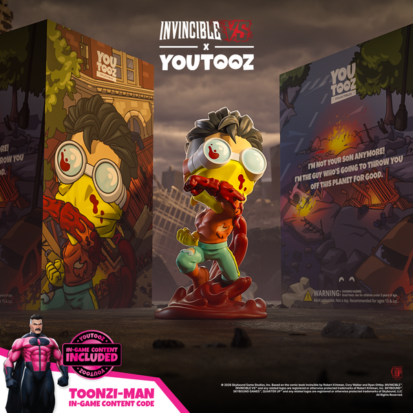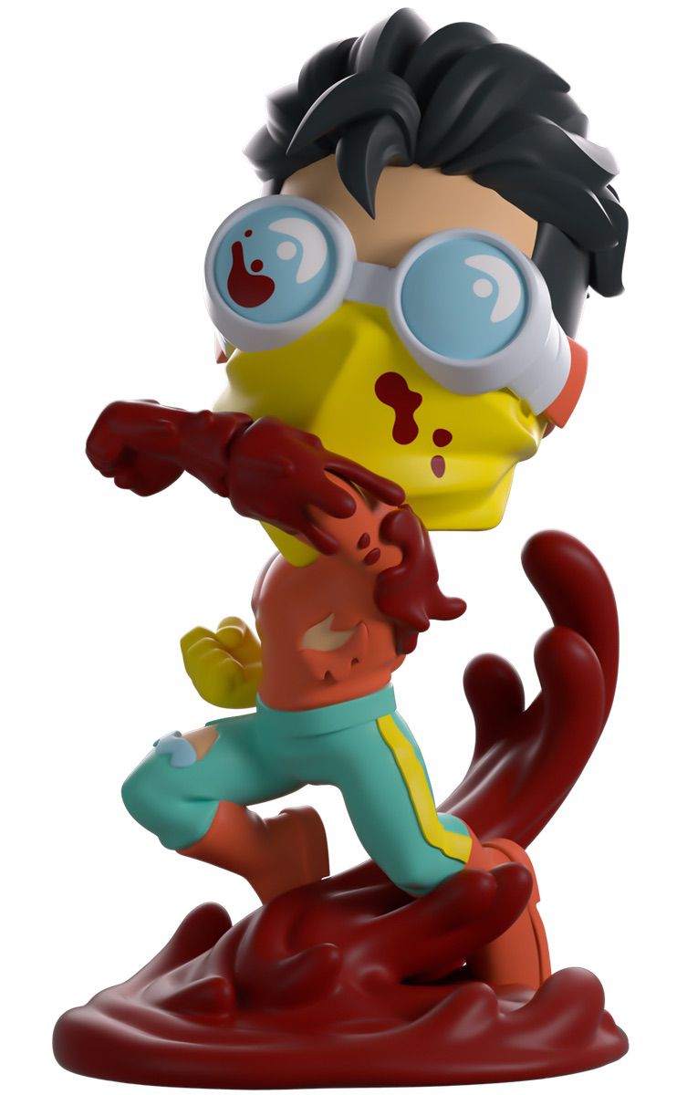 Invincible’s next showdown is in the Youtooz Arena, and this is one fight we’re definitely not going to win! Floating at 4.9 inches tall and swinging a blood-soaked punch across his body with thick drops smearing down the arm, dark red blood splatters across the yellow bandana and blue lensed goggles that wrap around his face as a short black undercut sweeps over his head. Wearing a torn long orange sleeve shirt and light blue pants with yellow stripes running down the sides that match his gloves, a sea of thick red blood swirls around his boots with long tendrils curling around his back. The exterior of his packaging sees bright flames covering a ruined Chicago street, while the interior is filled with blue and orange streaks of light. The protective sleeve is then covered in a mottled dark blue and black as his figure can be seen through the large, clear window at the packaging’s front. This collectible ships in a matte, embossed, protective outer sleeve and a custom-sized plastic protector for maximum protection during shipping.