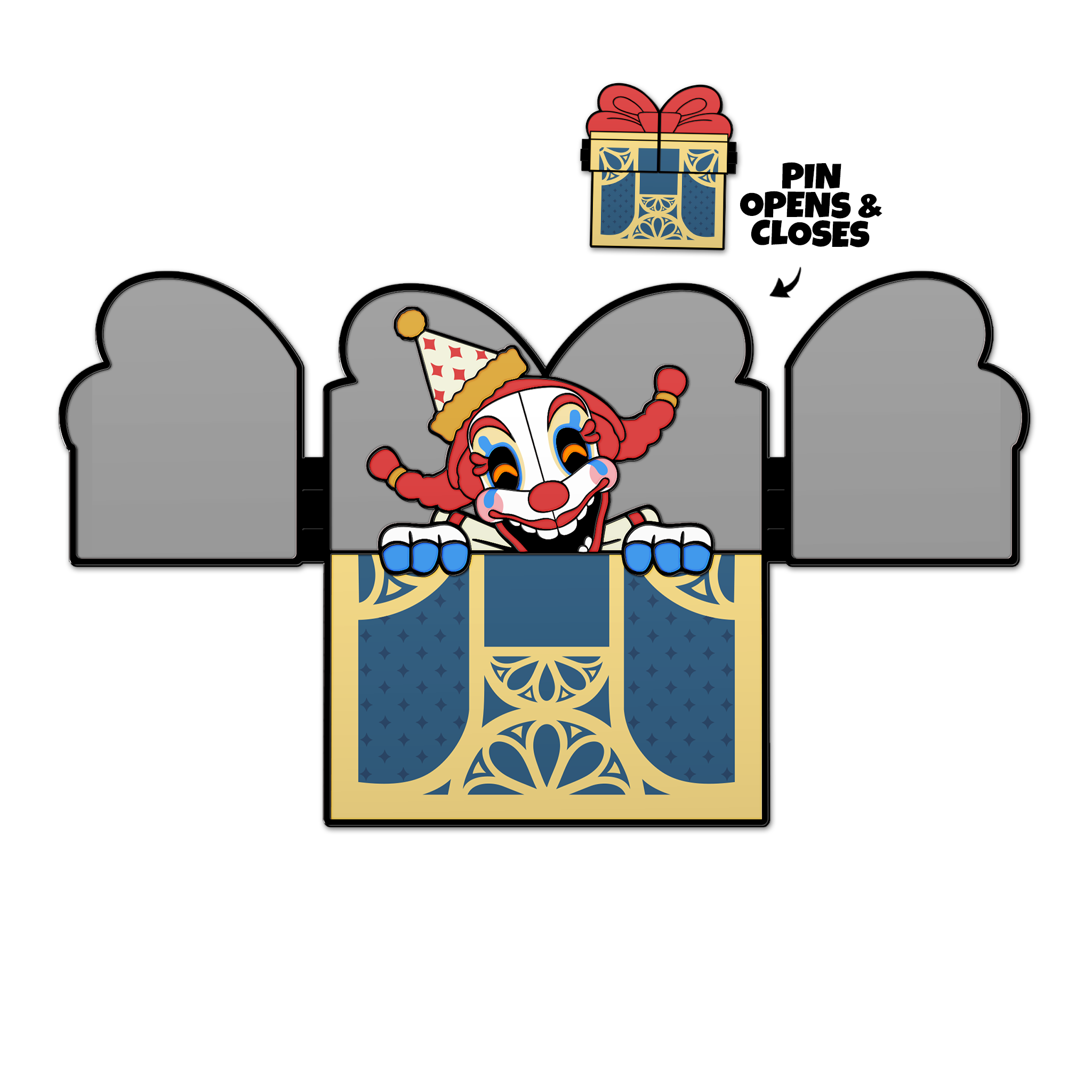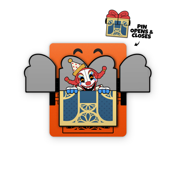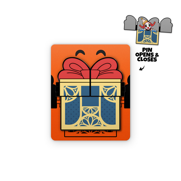 We’ve got a present for you! Wait, you want to open it? We’ll just be over here when you do… At 2 inches tall with a shiny, high-quality finish, this pin sees an ornate yellow and blue present with a red bow on the top that opens with two hinges to reveal a terrifying Jackie peering over the top! Perfect as decoration on a corkboard or showing off on your tote bag, backpack, fanny pack, jacket or wherever your heart desires, this pin is sure to turn heads and catch the eyes of anyone you pass, letting them know who’s ready for a scare!