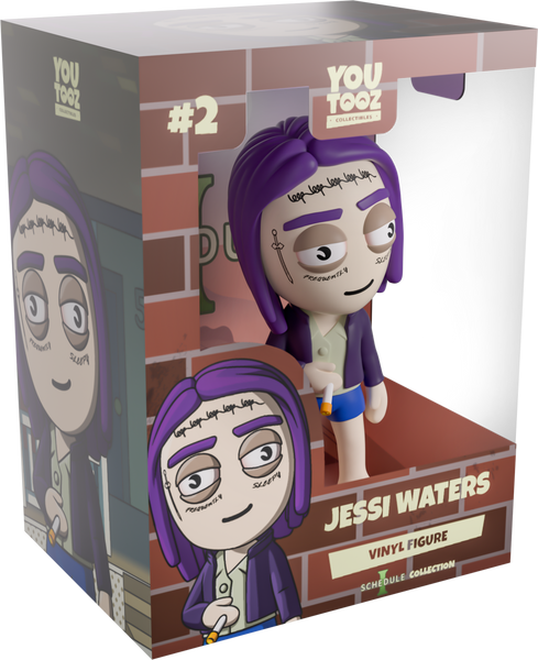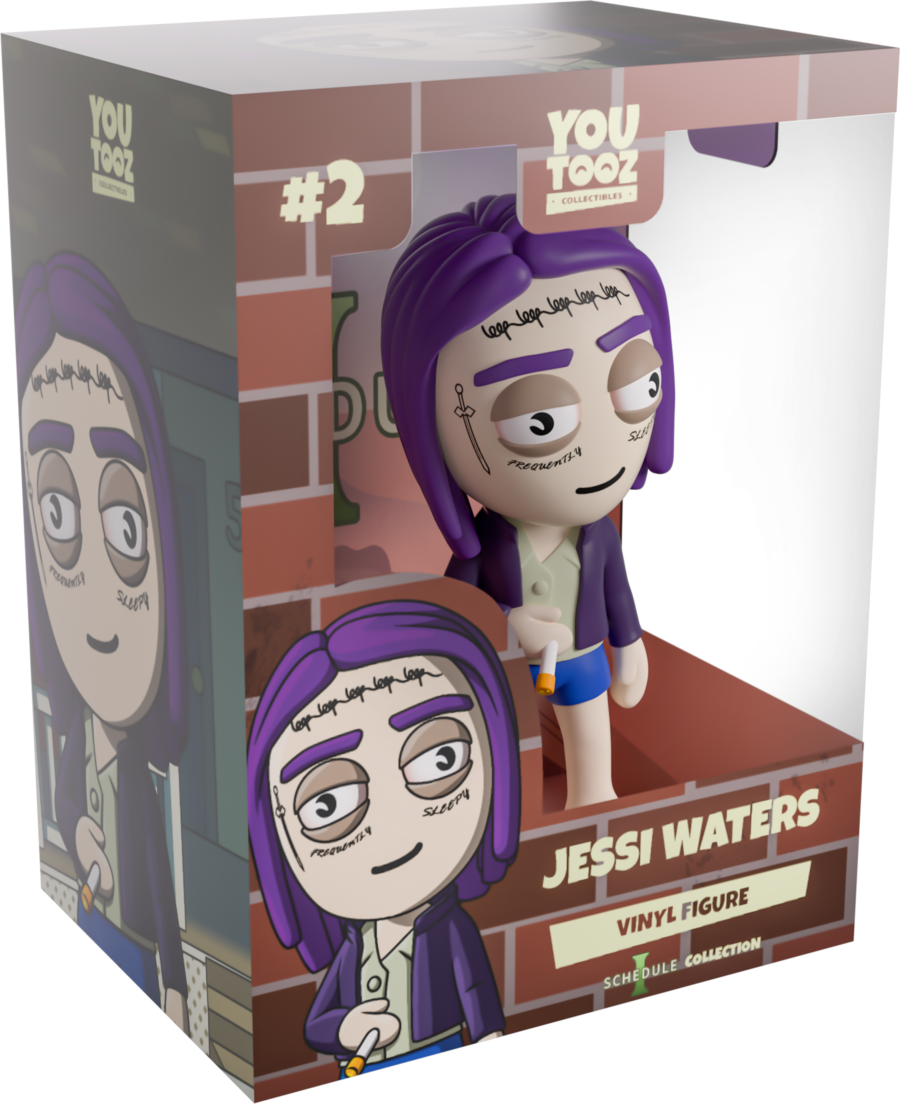 Have you got the stuff? You know the… good stuff??... Oh yeah, that’s it! The Jessi Waters Youtooz! Standing at 4.5 inches tall and tilting her head to the side with deep purple hair hanging down to her shoulders, tattoos run down the side and across the forehead of her pale face while curving under each dark eye. Dressed in a dark blue jacket over her pale green shirt and short shorts, she holds a lit joint in her right hand and wears dark slides. The exterior of her packing sees her standing behind the white railing of the motel, while the interior looks onto a dusty pink desert with a single barren road running over a shaded hill. The protective sleeve is then covered in plants under hazy purple light as his figure can be seen through the large, clear window at the packaging’s front. This collectible ships in a matte, embossed, protective outer sleeve and a custom-sized plastic protector for maximum protection during shipping.