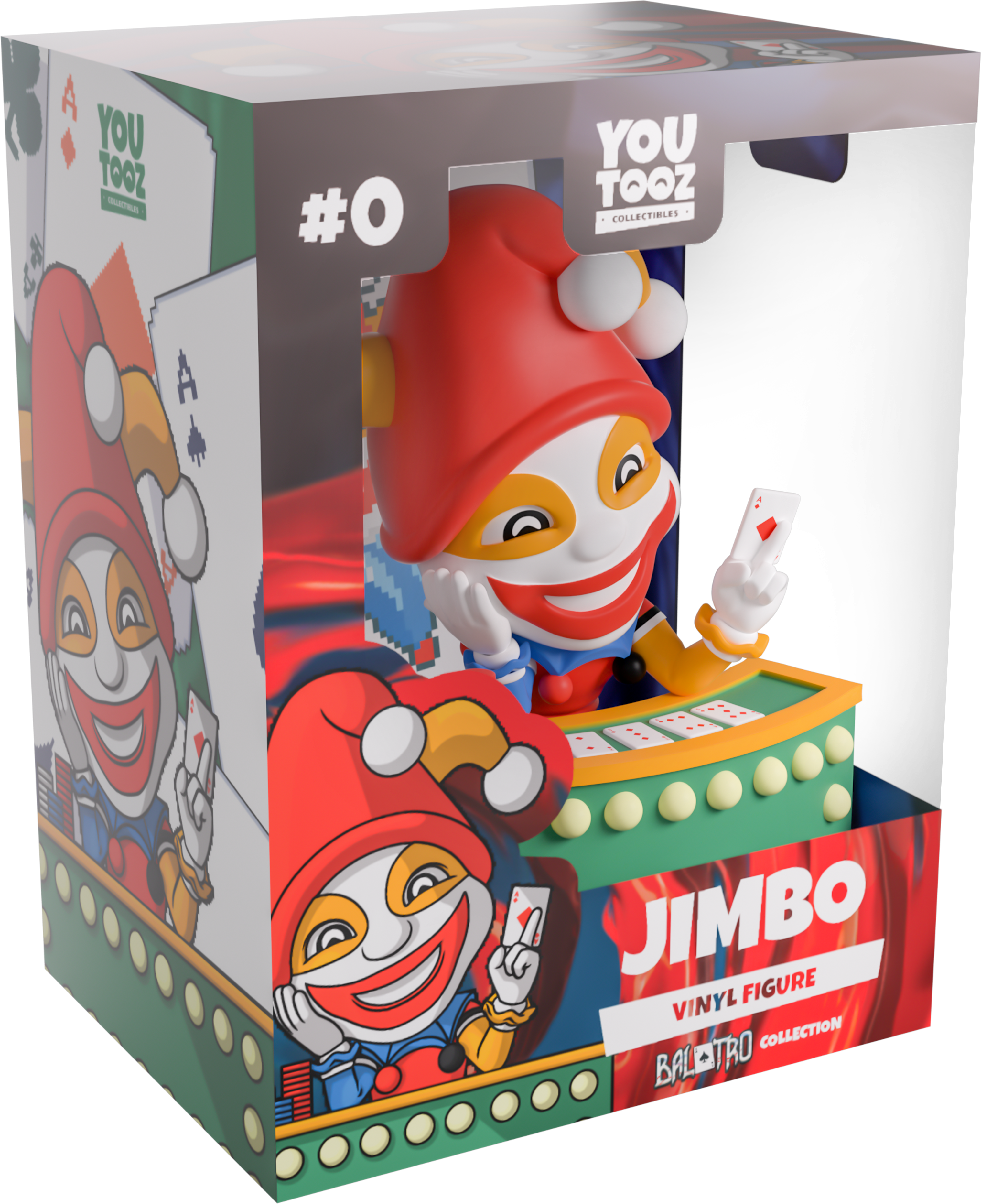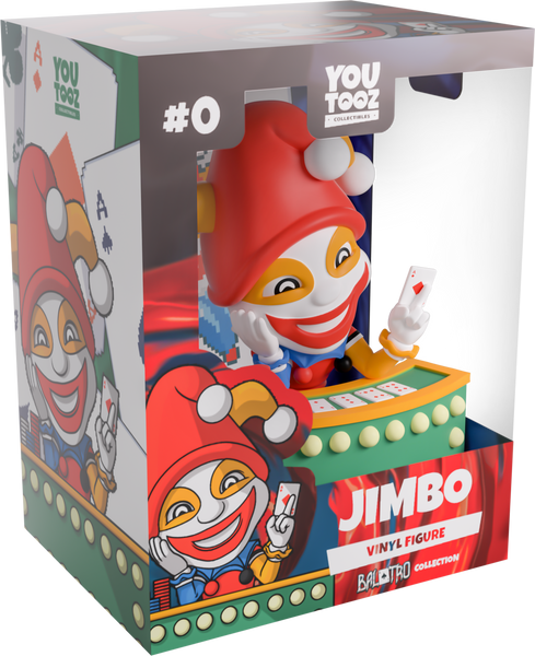 Ready for a game? How’s your luck?! Jimbo’s arrived at Youtooz to see if you can set a new high score with his debut! Sitting at 4.7 inches tall behind a green and yellow poker table that has pale lights running across the front, his head rests on a gloved right hand as his white face is covered in red and orange makeup that match the three-pronged jester hat atop his head. Holding an ace of diamonds in between the fingers of his left hand, he’s dressed in a red, blue and orange shirt with a frilled collar that has pom poms hanging from its edges and multicoloured pants as three stacks of chips rest to his side. The exterior of his packaging sees a poker hand full of aces and a Joker card at the center, while playing cards litter the interior over a swirling blue background. This then transforms into a vivid red to billow over the protective sleeve, where his figure can be seen through the large, clear window at the packaging’s front. This collectible ships in a matte, embossed, protective outer sleeve and a custom-sized plastic protector for maximum protection during shipping.