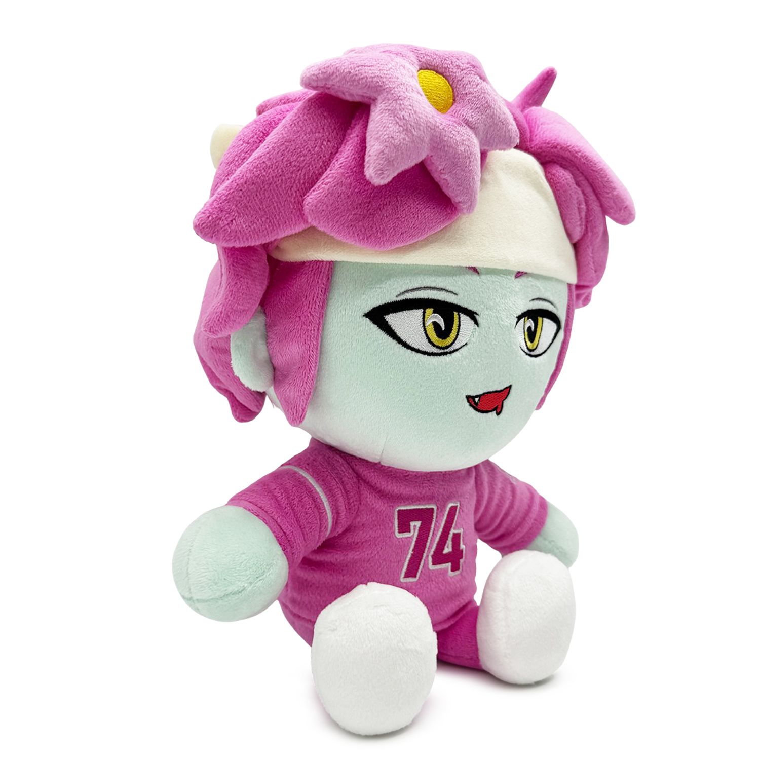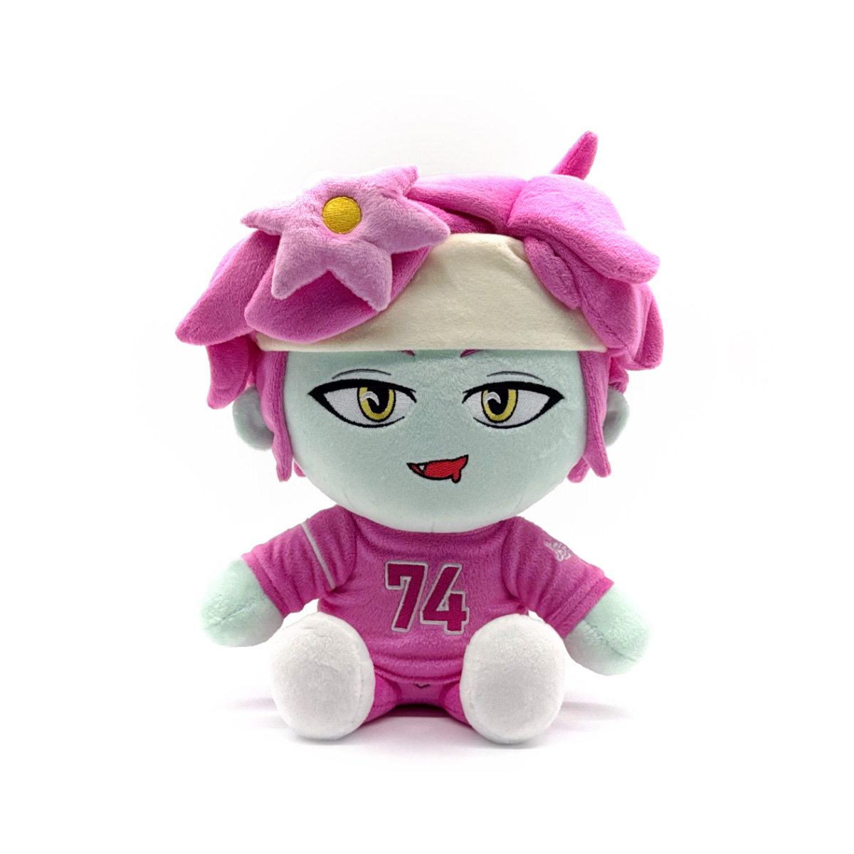 JSTN has joined us here at the Youtooz detective agency because there is a murder mystery to be solved! Sitting at 9 inches tall his legs kicked forward and dressed in white sneakers and a pink tracksuit with the numbers "74" printed on his chest, he's accessorized with a white headband that holds luscious pink locks out of his pale face and yellow eyes as a pink flower rests on his fringe adding to add pizzazz to his look! This plush is packed to the seams with 100% PP cotton and is made of the softest minky material, perfect for cuddling or solving mysteries with!