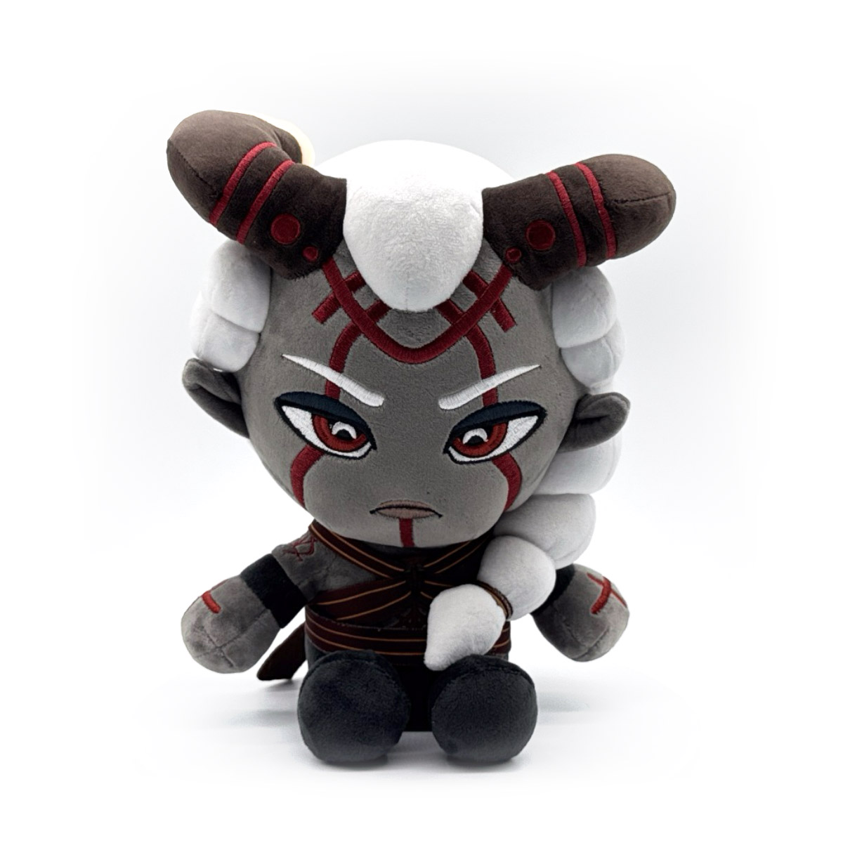 From the world of Regolus: Dark Age, Katari has emerged! Sitting at 9 inches tall with her legs kicked forward and dressed in black shoes and pants with a red and yellow striped belt that matches an X-shaped bandeau top, her grey skin is covered with red tattoos that run over her arms, chest and stern face. With long white hair pulled back into a long braid that falls over her shoulder, a pair of curved horns poke out from the top of her head and have red marking and yellow tips. This plush is packed to the seams with 100% PP cotton and is made of minky and tricot materials with accents of felt, perfect for cuddling!