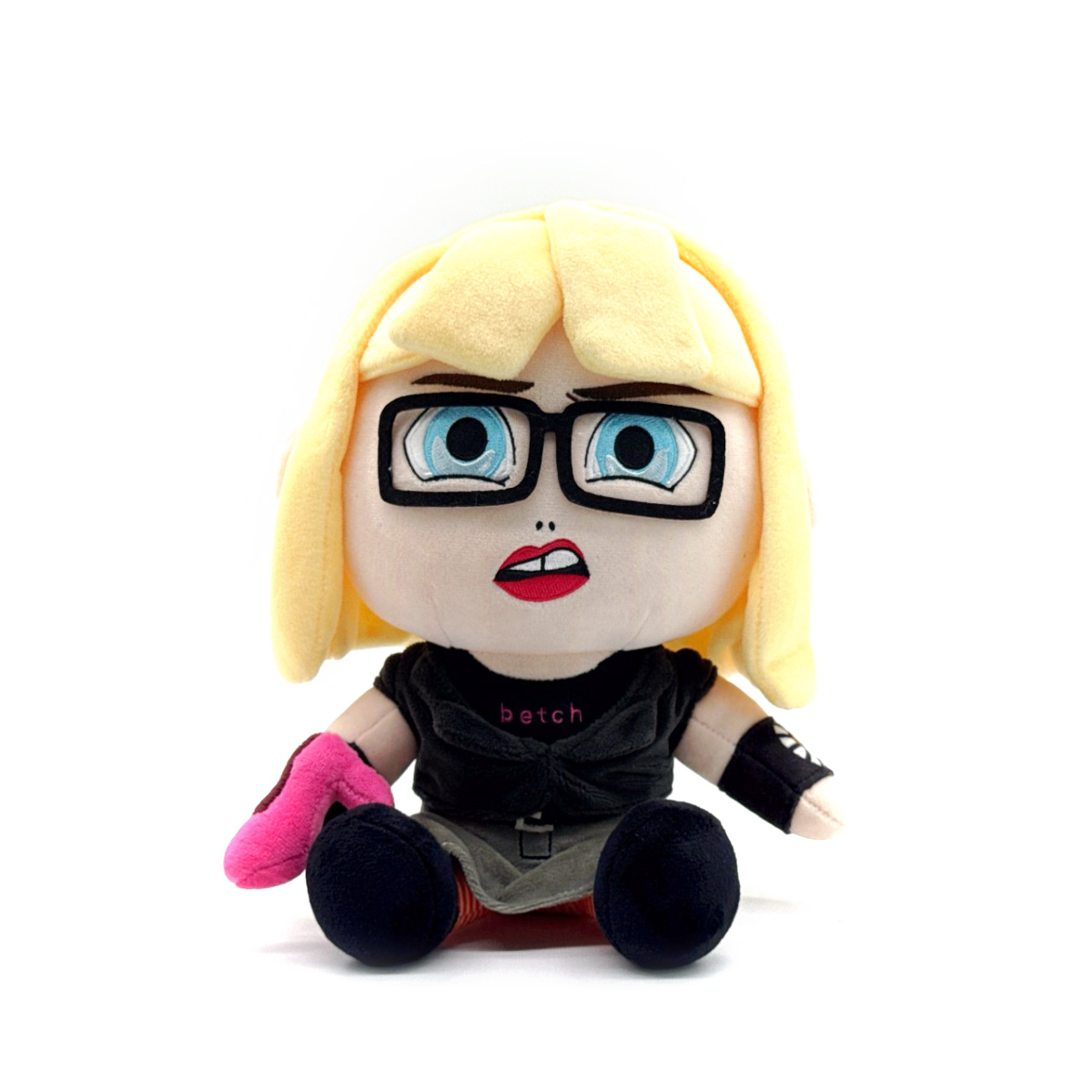 Get your shoes ready, Kelly's here to inspect them because no one knows shoes like Kelly knows shoes! Making her plush debut, this iconic footwear maven sits at 9 inches tall (more than double her shoe size btw) with legs kicked forward to show off strappy black shoes and wears striped leggings, a green skirt, dark vest and a black t-shirt that has the word "betch" in pink across the chest. With her grimacing face framed by a blonde bob and straight cut bangs as thick black rimmed glasses cover blue eyes and rest above a red lip, Kelly doesn't go anywhere without an extra pair of shoes and holds a pink pump in her right hand. This plush is packed to the seams with 100% PP cotton and is made of the softest minky material, perfect for cuddling or shoe shopping with!
