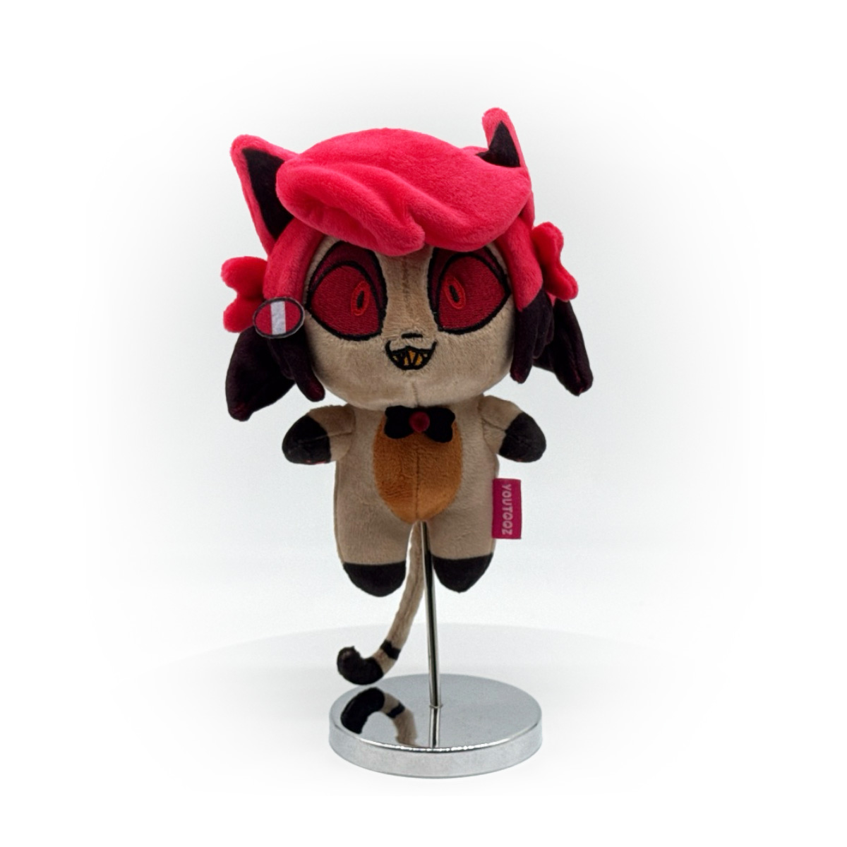 Aww, Alastor! You’re looking so cute! Wait, put those claws away, OUCH! Standing at 5 inches tall with deep red eyes looking out over an evil yellow smile full of sharp teeth, as a monocle rests on his cheek, pointed ears poke out from the top of his pink hair that has black ends as a bowtie rests under his chin and pink paws hang to either side of his brown cat body with a long tail curling underneath. This keychain is packed to the seams with 100% PP cotton and is made of the softest minky material with accents of felt and a keyring attached to the top by a pink tag, absolutely perfect to hang from your backpack, purse, pants or wherever you want to show who’s ready to put on a show!