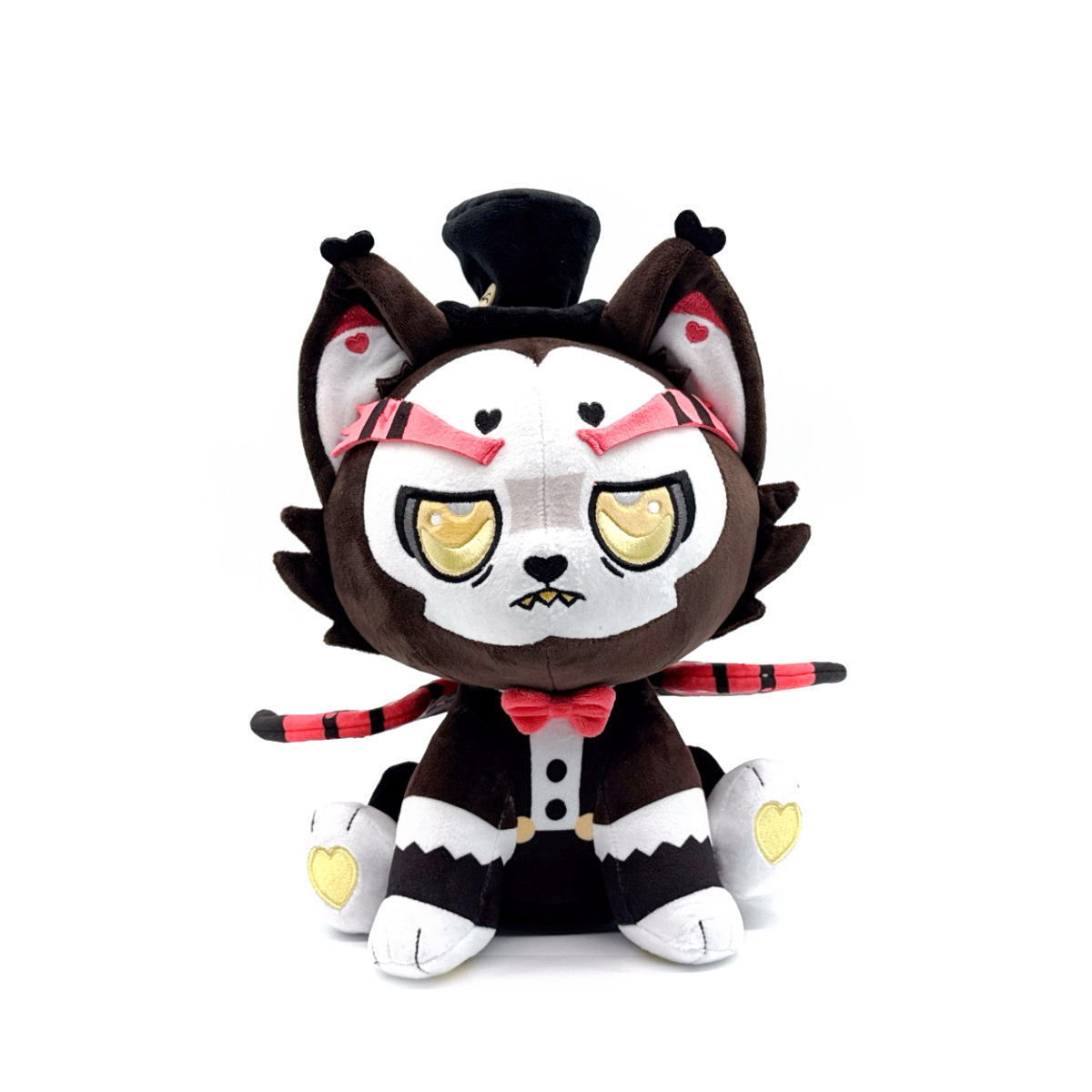 Husk lost his last bet with Youtooz, so we turned him into the most adorable kitty you could ask for! Sitting at 9 inches tall with long red and black eyebrows curving over unimpressed half-lidded yellow eyes, a sharp toothed frown curves under his heart shaped nose as he wears a small black top hat between rounded brown cat ears. With jagged fur flicking out from either side of his face as a pair of spotted wings extend from each shoulder, he wears black overalls and a red bowtie as the yellow pads of his feet kick forward. This plush is packed to the seams with 100% PP cotton and is made of the softest minky material with accents of felt, absolutely perfect for cuddling or grabbing a drink with!