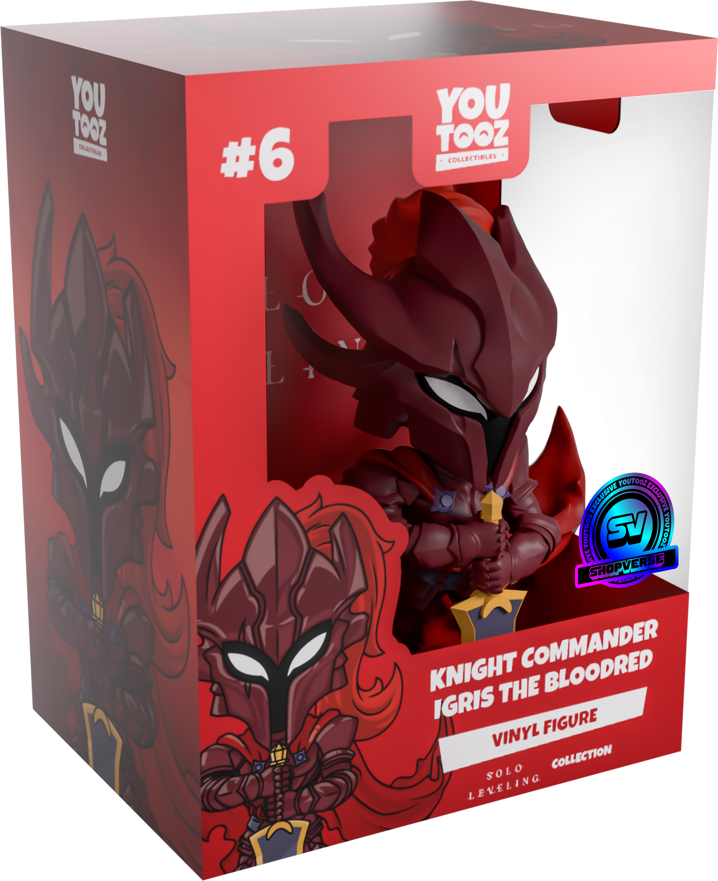 We’ve finally made it to the end of the Job Change quest dungeon and are ready to face the Bloodred himself! Standing at 5.3 inches tall and posed with his arms bent as he holds a thick, pointed greatsword in both hands with its tip on the ground, white eyes shine from his angular helm, which has a pair of cleaved horns on its left side and a mane of deep red hair flowing out from the back. With his body covered in segmented dark red armour that has grey accents on the chest and waist, a long jagged cloak flicks out to the side as it curls in the wind. The exterior of his packaging looks down a long throne room with tall columns and a dazzling chandelier. The interior then is covered in a deep red gradient with the ‘Solo Levelling’ logo printed on the back, while the protective sleeve looks up at a dilapidated building as a large red moon shines above a city skyline, and his figure can be seen through the large clear window at the packaging’s front. This collectible ships in a matte, embossed, protective outer sleeve and a custom-sized plastic protector for maximum protection during shipping.